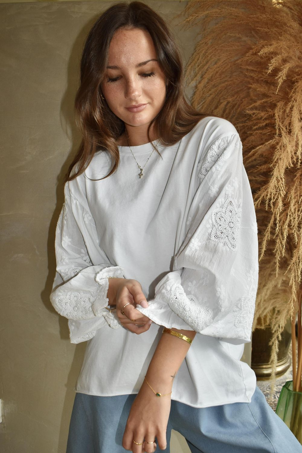 Elevate your everyday wardrobe with our Atik Batwing Top, a modern silhouette inspired by romantic vintage dressing and contemporary fashion styling, slips into your wardrobe to wear with pieces from our Lagen or Paloma collection. Made from lightweight stretch pure cotton jersey, the body offers breathable comfort with a flattering, easy drape. The classic round neckline keeps the shape timeless — a nod to traditional wardrobe staples that form the foundation of effortless style. The dramatic batwing sleeves draw inspiration from Victorian and Edwardian-era shirting, where volume and detail were key design features. Made from structured shirting cotton, they create a beautiful contrast against the soft jersey body. The shirring elasticated cuff, finished with a gentle frill hem, allows you to style the sleeve with as much volume and drama as you desire — echoing the romantic sleeve revival seen across modern fashion collections. Intricate crocheted cotton floral appliqué and subtle tonal embroidery pay homage to traditional handcraft techniques, celebrating texture and artisanal detail. These delicate embellishments add depth and dimension while maintaining a refined, understated finish — perfectly balancing femininity with everyday wearability.