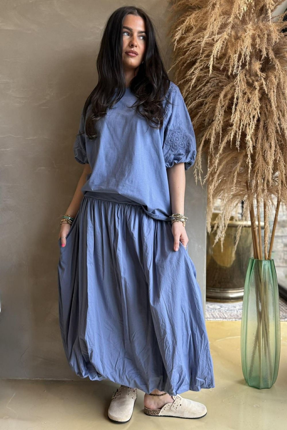 Elevate your everyday wardrobe with our Atik Bubble Sleeve Top, a modern silhouette inspired by romantic vintage dressing and contemporary fashion styling, slips into your wardrobe to wear with pieces from our Lagen or Paloma collection. Made from lightweight stretch pure cotton jersey, the body offers breathable comfort with a flattering, easy drape. The classic round neckline keeps the shape timeless — a nod to traditional wardrobe staples that form the foundation of effortless style. The raglan bubble sleeves draw inspiration from Victorian and Edwardian-era shirting, where volume and detail were key design features. Made from structured shirting cotton, they create a beautiful contrast against the soft jersey body. The shirring elasticated cuff, allows you to style the sleeve with as much volume and drama as you desire — echoing the romantic sleeve revival seen across modern fashion collections. Intricate crocheted cotton floral appliqué and subtle tonal embroidery pay homage to traditional handcraft techniques, celebrating texture and artisanal detail. These delicate embellishments add depth and dimension while maintaining a refined, understated finish — perfectly balancing femininity with everyday wearability.
