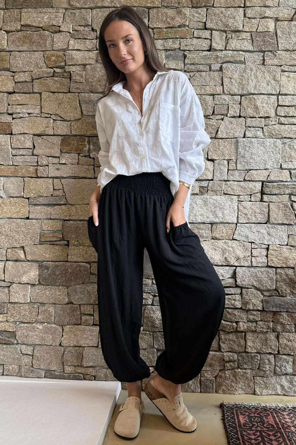 These women’s one-size lightweight harem-style pants, designed with a soft, stretchy shirred waistband for all-day comfort and an easy pull-on fit. Made from breathable, airy viscose fabric, these relaxed-fit casual pants are ideal for warm weather, travel, and everyday wear. The elastic cuffed ankles create a modern jogger-style silhouette that’s both flattering and on-trend, while a practical side pocket adds everyday functionality without compromising the clean, flowy look. The soft, textured fabric offers a wrinkle-friendly, low-maintenance finish, making these pants perfect for packing and busy lifestyles. Designed for comfort and movement, these loose-fit summer pants for women are perfect for lounging, yoga, travel, or casual outings, making them a versatile must-have for any wardrobe.