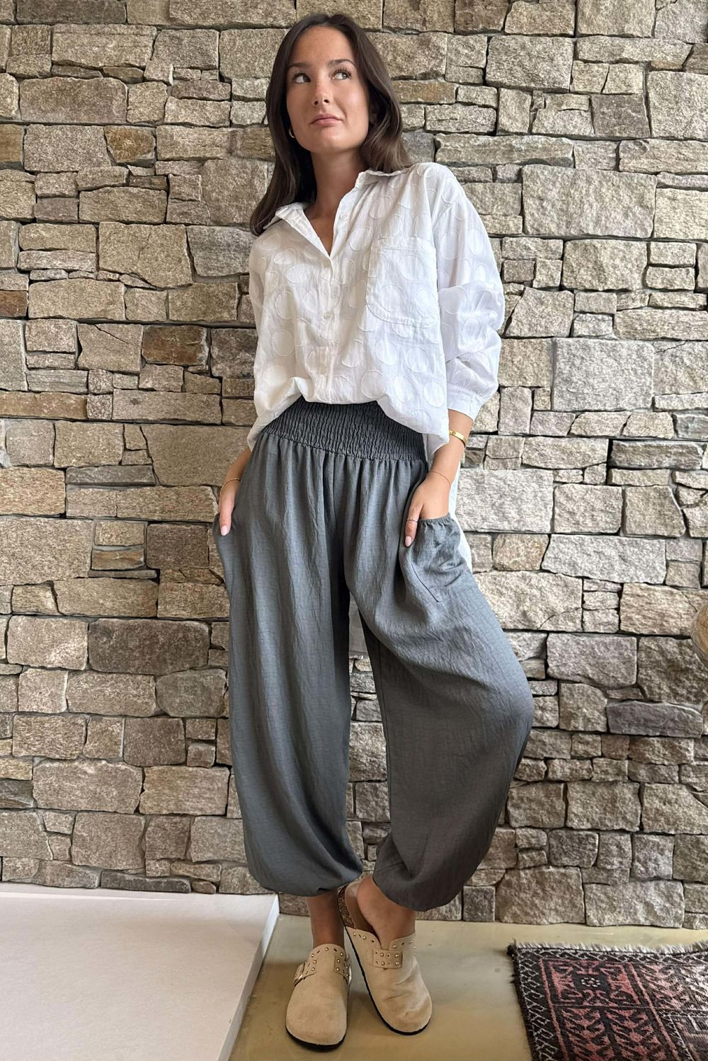These women’s one-size lightweight balloon-style pants, designed with a soft, stretchy shirred waistband for all-day comfort and an easy pull-on fit. Made from breathable, airy viscose fabric, these relaxed-fit casual pants are ideal for warm weather, travel, and everyday wear. The elastic cuffed ankles create a modern jogger-style silhouette that’s both flattering and on-trend, while a practical side pocket adds everyday functionality without compromising the clean, flowy look. The soft, textured fabric offers a wrinkle-friendly, low-maintenance finish, making these pants perfect for packing and busy lifestyles. Designed for comfort and movement, these loose-fit summer pants for women are perfect for lounging, yoga, travel, or casual outings, making them a versatile must-have for any wardrobe.