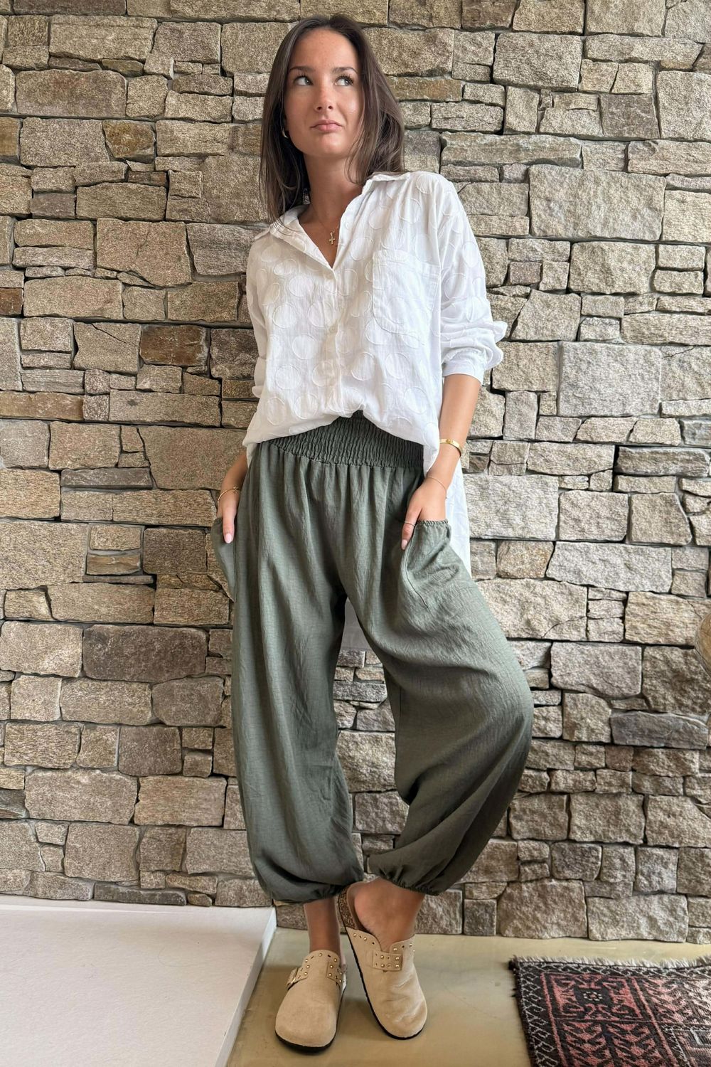 These women’s one-size lightweight balloon-style pants, designed with a soft, stretchy shirred waistband for all-day comfort and an easy pull-on fit. Made from breathable, airy viscose fabric, these relaxed-fit casual pants are ideal for warm weather, travel, and everyday wear. The elastic cuffed ankles create a modern jogger-style silhouette that’s both flattering and on-trend, while a practical side pocket adds everyday functionality without compromising the clean, flowy look. The soft, textured fabric offers a wrinkle-friendly, low-maintenance finish, making these pants perfect for packing and busy lifestyles. Designed for comfort and movement, these loose-fit summer pants for women are perfect for lounging, yoga, travel, or casual outings, making them a versatile must-have for any wardrobe.