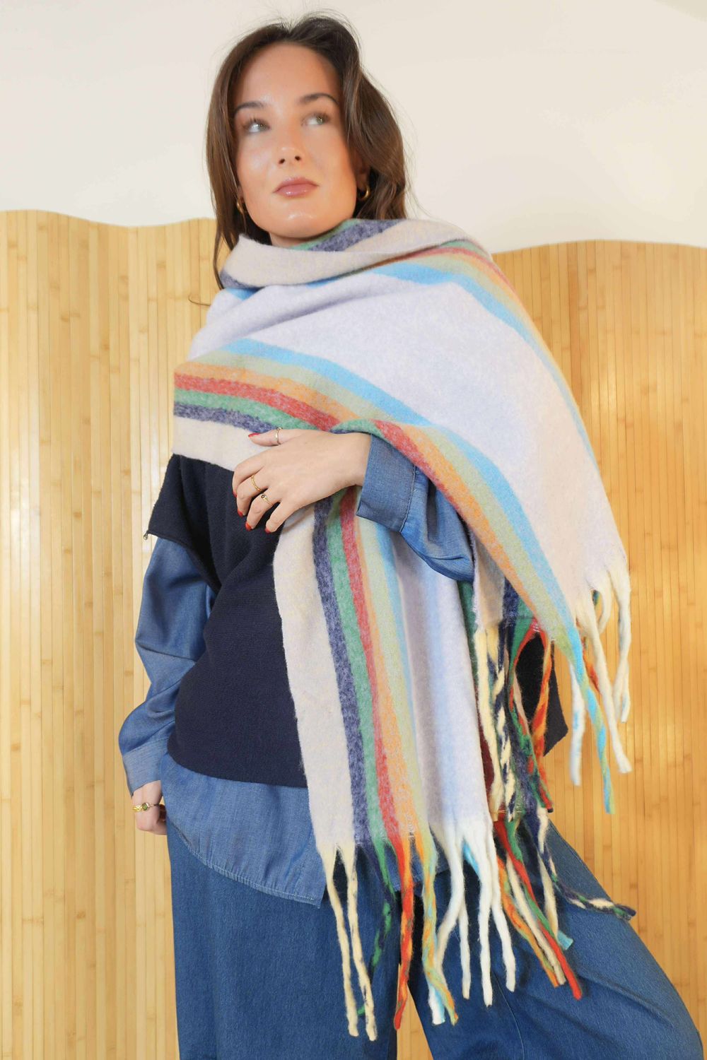 - Features a classic stripe in lilac, yellow, green, purple, red and blue tones, blending tradition with a playful pop of colour
