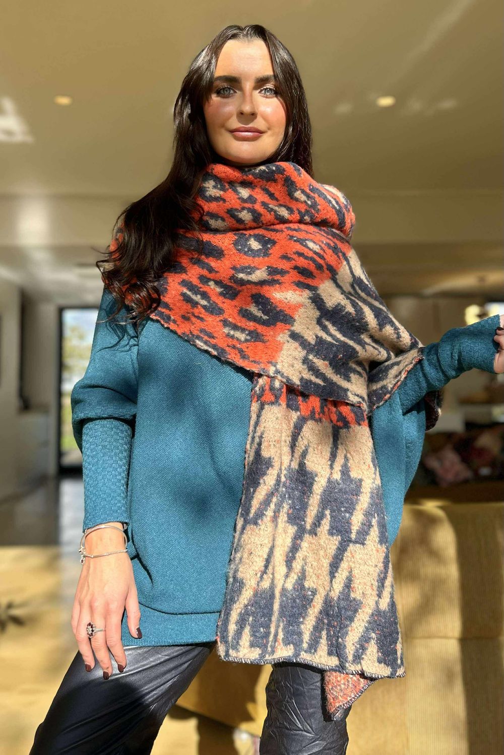 Don’t be fooled by the bold mix of leopard and houndstooth—this oversized knit scarf is the ultimate neutral you didn’t know your wardrobe needed. The classic prints blend seamlessly in a warm, wearable palette that pairs effortlessly with everything from your everyday denim to blanket coats and cosy knitwear. Made from a super soft, cosy knit fabric, it feels like a warm hug on chilly days while adding instant edge to even the simplest outfits. Drape it, wrap it, or throw it over your shoulders—no matter how you style it, this piece will elevate your look.