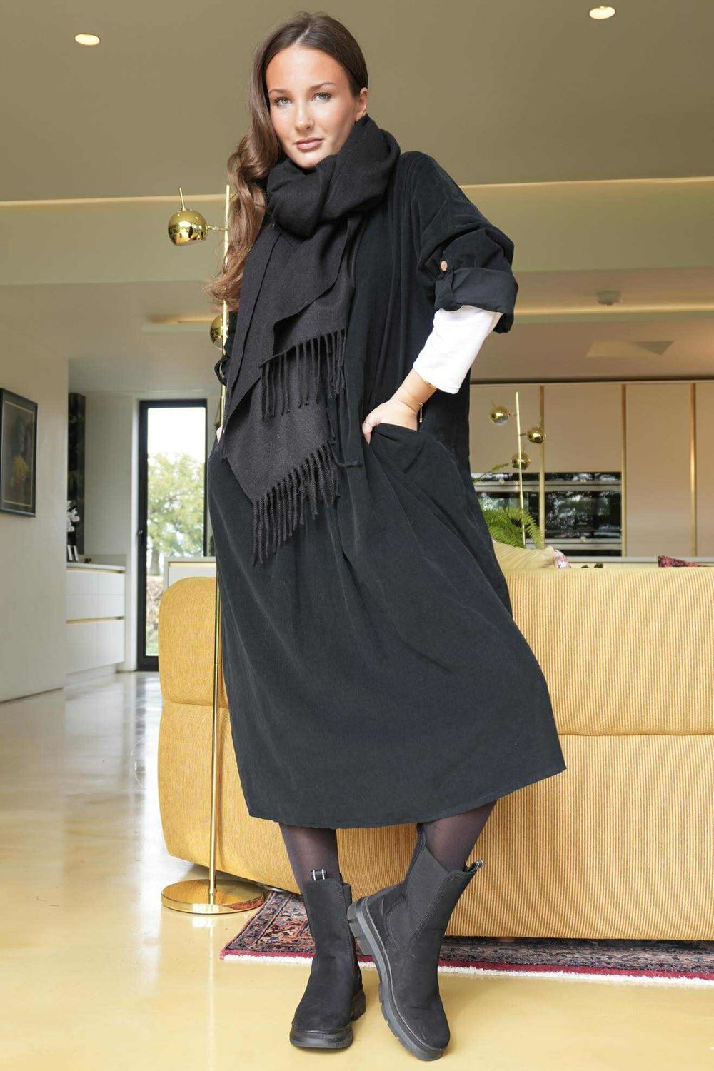 A modern classic with timeless appeal, this smock dress is designed in a softly structured silhouette that flatters while remaining effortlessly wearable. The top panel and arms are crafted from 100% cotton with just the right amount of stretch, ensuring all-day comfort without compromising on style. Featuring long sleeves with an epaulette fastening, the dress allows you to adjust the sleeve length for a versatile look. A classic round neckline keeps the design understated yet chic, while the needlecord skirt brings texture and movement. Practicality meets style with two hidden pockets, making this an easy go-to for everyday wear or elevated casual dressing.