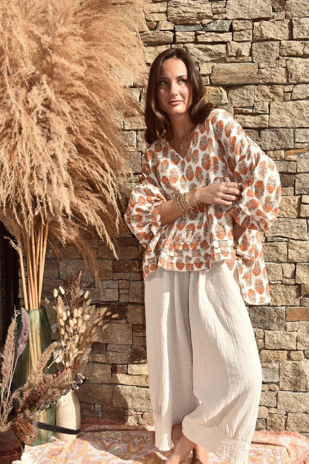 If your wardrobe is craving effortless bohemian charm, the Daughter of Ibiza Smock Top is your new go-to. Draped in soft double cotton that feels like a gentle breeze, it’s adorned with a dreamy floral Indira print in merlot and mauve on a warm vanilla canvas—an homage to traditional Indian textiles with a globally inspired twist. The relaxed V-neckline, bangle-length balloon sleeves, and delicate frill details make it effortlessly elegant yet playfully feminine. Whether paired with trousers from our Basso or Paloma collections, or styled with the matching bloomer pants in the same print and fabric from the Daughter of Ibiza collection, this is the piece that turns everyday moments into sun-drenched style statements.