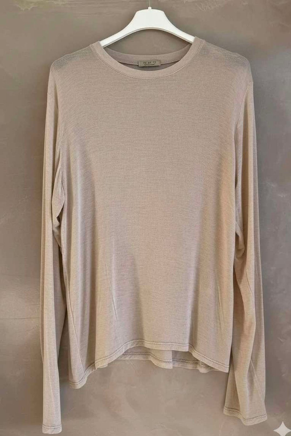 - One size women's long sleeve top in oatmeal, beige.
