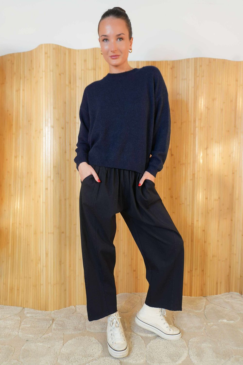 Our new barrel pant is designed to flatter while keeping comfort front and centre. Cut in a versatile ink blue, it features seam detailing that runs from the waistband to the ankle, creating a beautifully shaped silhouette. Made from a cotton blend fabric with a slight bounce, these pants feel supportive yet soft, making them comfortable enough to wear all day long. A super-soft elasticated waistband offers easy pull-on wear, while belt loops give you the option to style them with or without a belt. Finished with practical pockets—because wherever we can, we’ll always make room for a pocket!