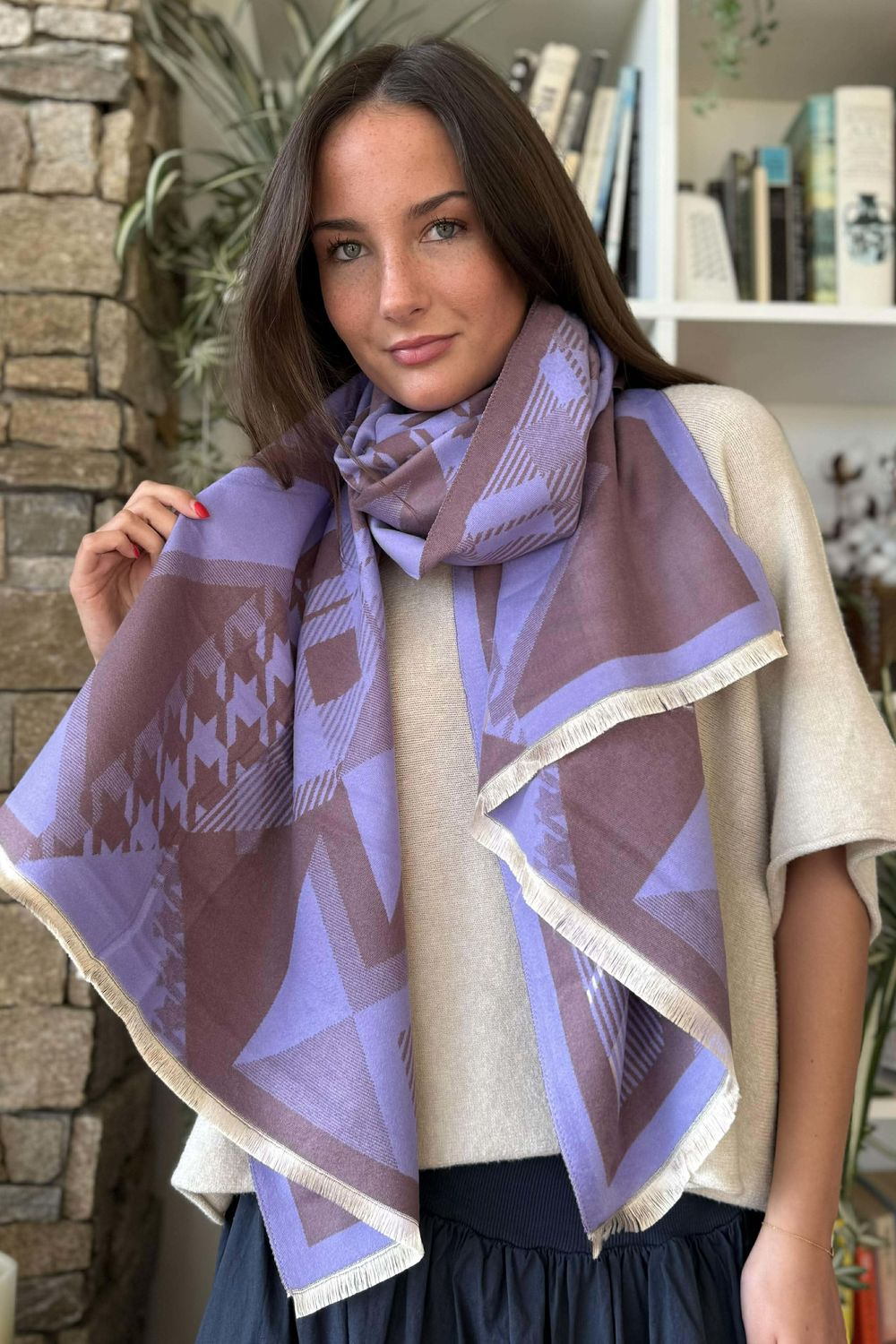 - Women's luxury blanket scarf with raw hem edging in purple and beige tones