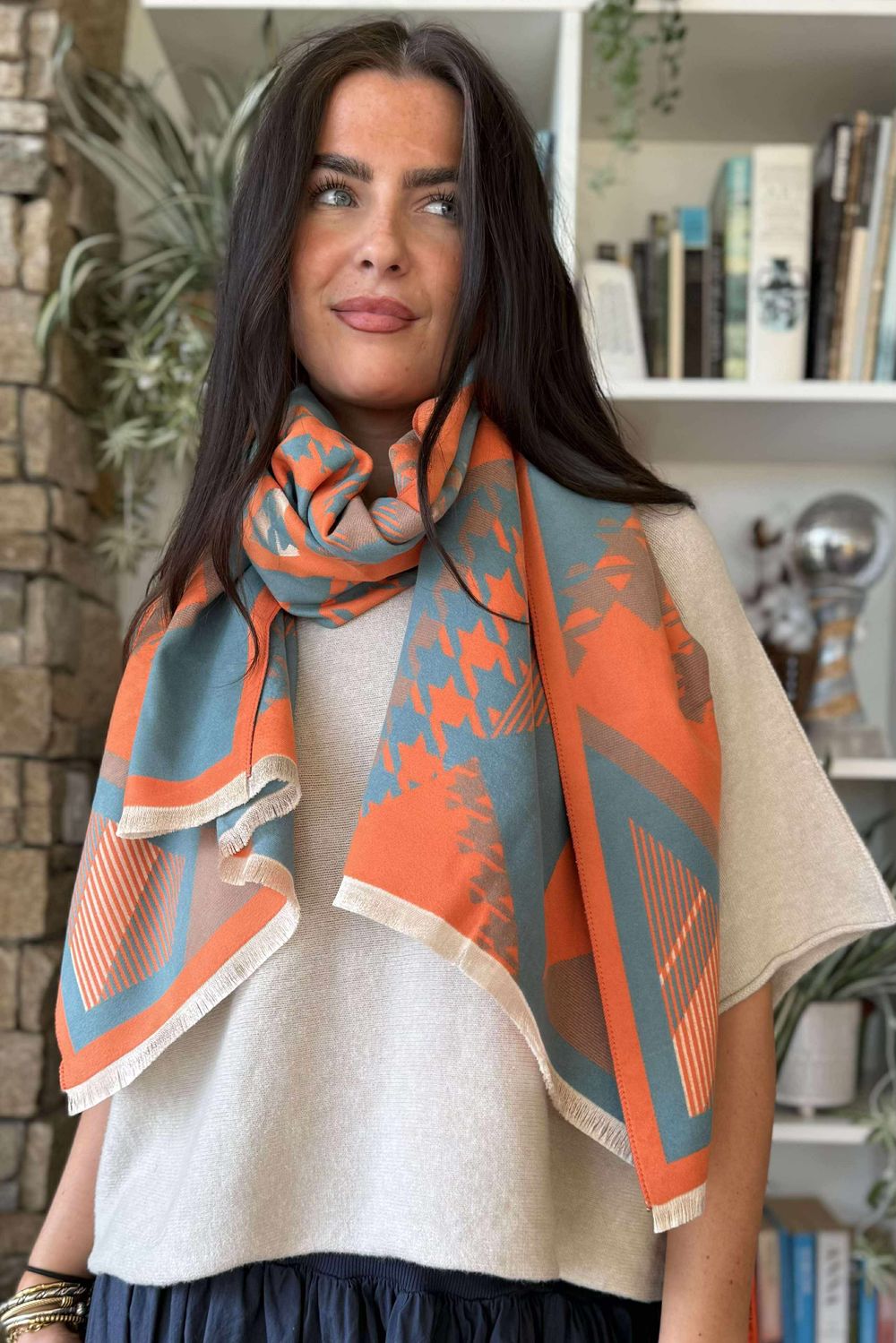 - Women's luxury blanket scarf with raw hem edging in orange, green and beige tones