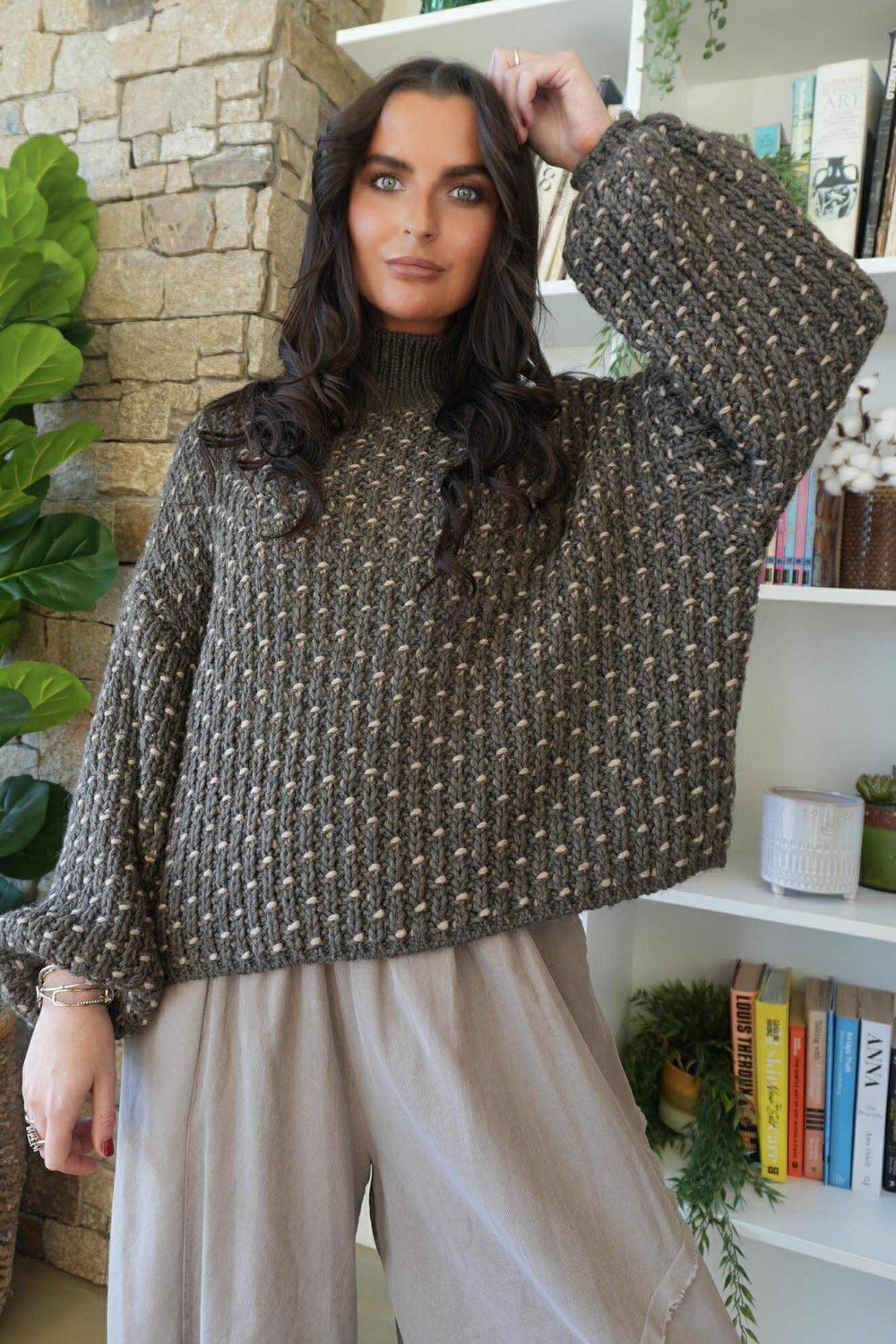 Wrap yourself in style and comfort with this flattering knit jumper, beautiful knit featuring contrasting stitches. Made from a super-soft, ultra-cosy knit, it delivers effortless everyday comfort and style. The modern funnel neck adds extra warmth and a contemporary silhouette, making it perfect for cooler days. With its relaxed, easy-going fit, this versatile jumper is ideal for layering or lounging, giving you a go-to piece you’ll reach for again and again.
