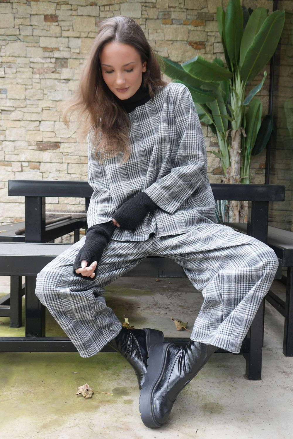 Elevate your everyday style with our one-size women’s top in a classic Prince of Wales plaid. Designed with a relaxed drop-shoulder silhouette, this piece is perfect for dressing up or down, offering effortless sophistication for any occasion.