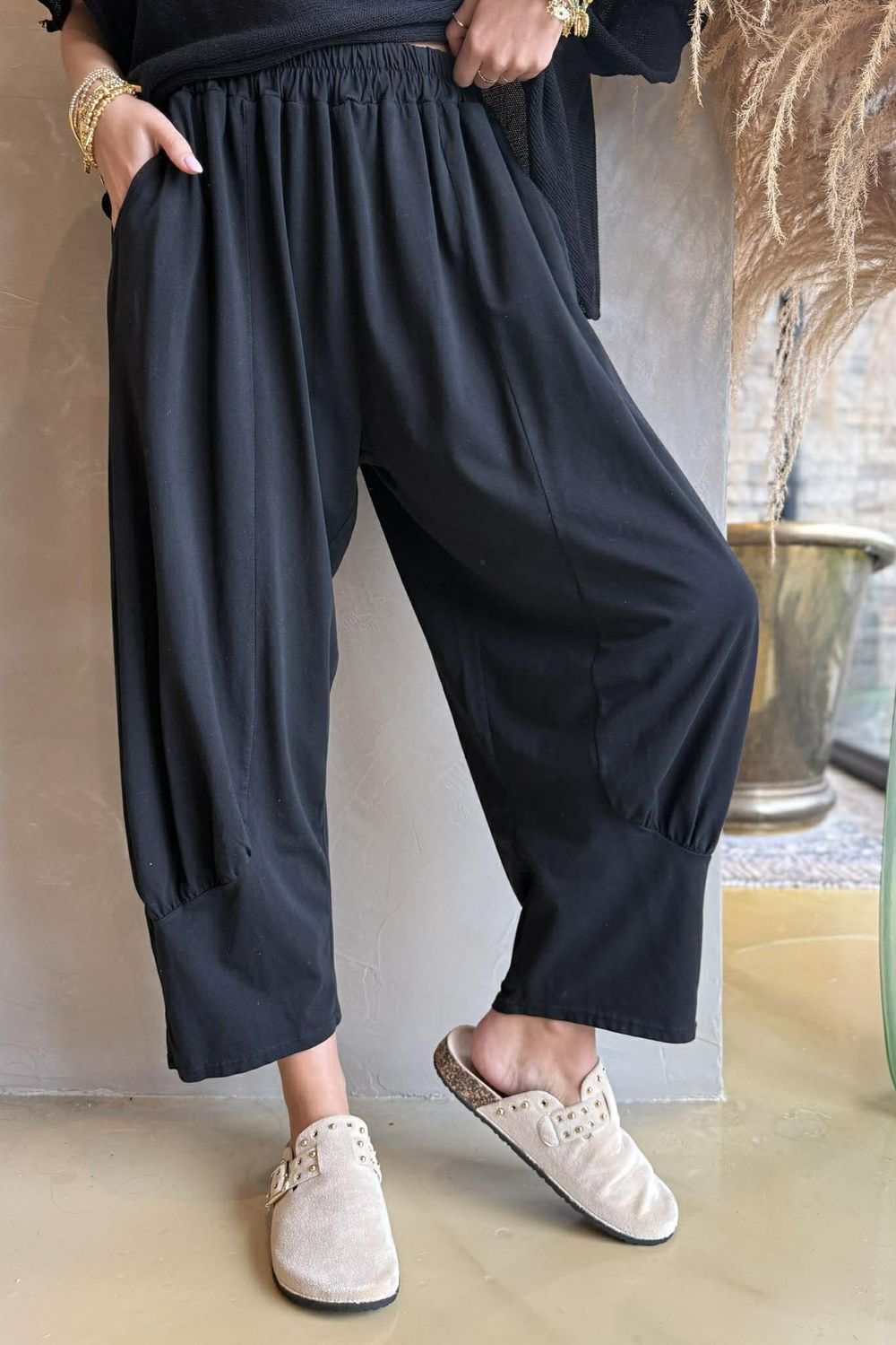 Designed with subtle panel detailing that flows down to a structured cuff, these black barrel pants blend modern tailoring with relaxed sophistication. The softly curved leg creates a flattering drape, making them the perfect alternative to wide-leg or straight-leg trousers.