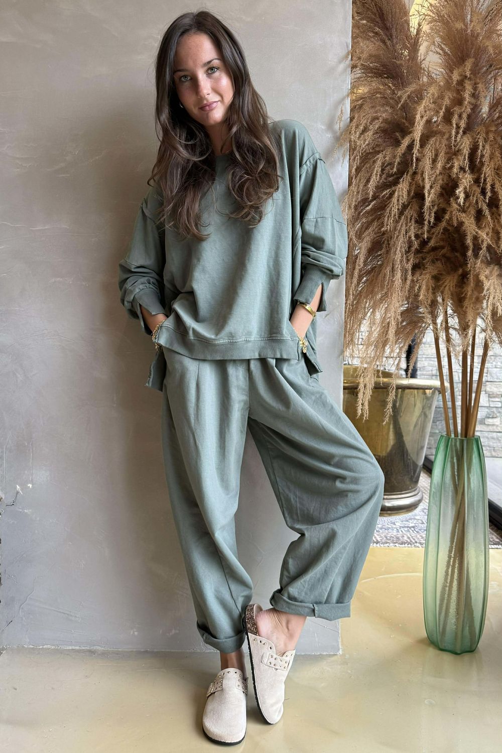 - Women's one size sweatshirt in soft khaki green, a versatile, classic hue that brings effortless elegance to any outfit.