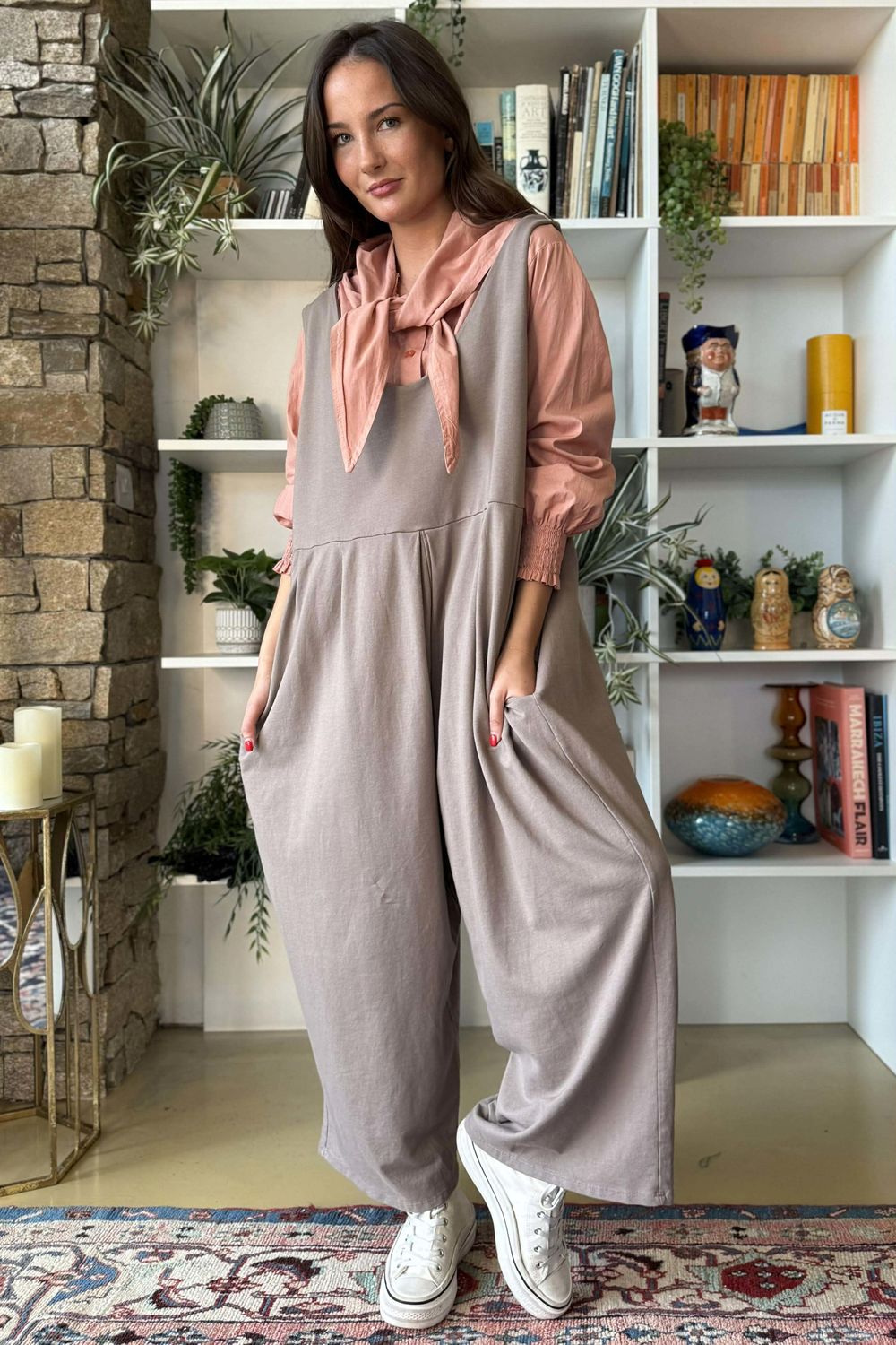 - Women's one-size jumpsuit in mocha, beige brown tone.