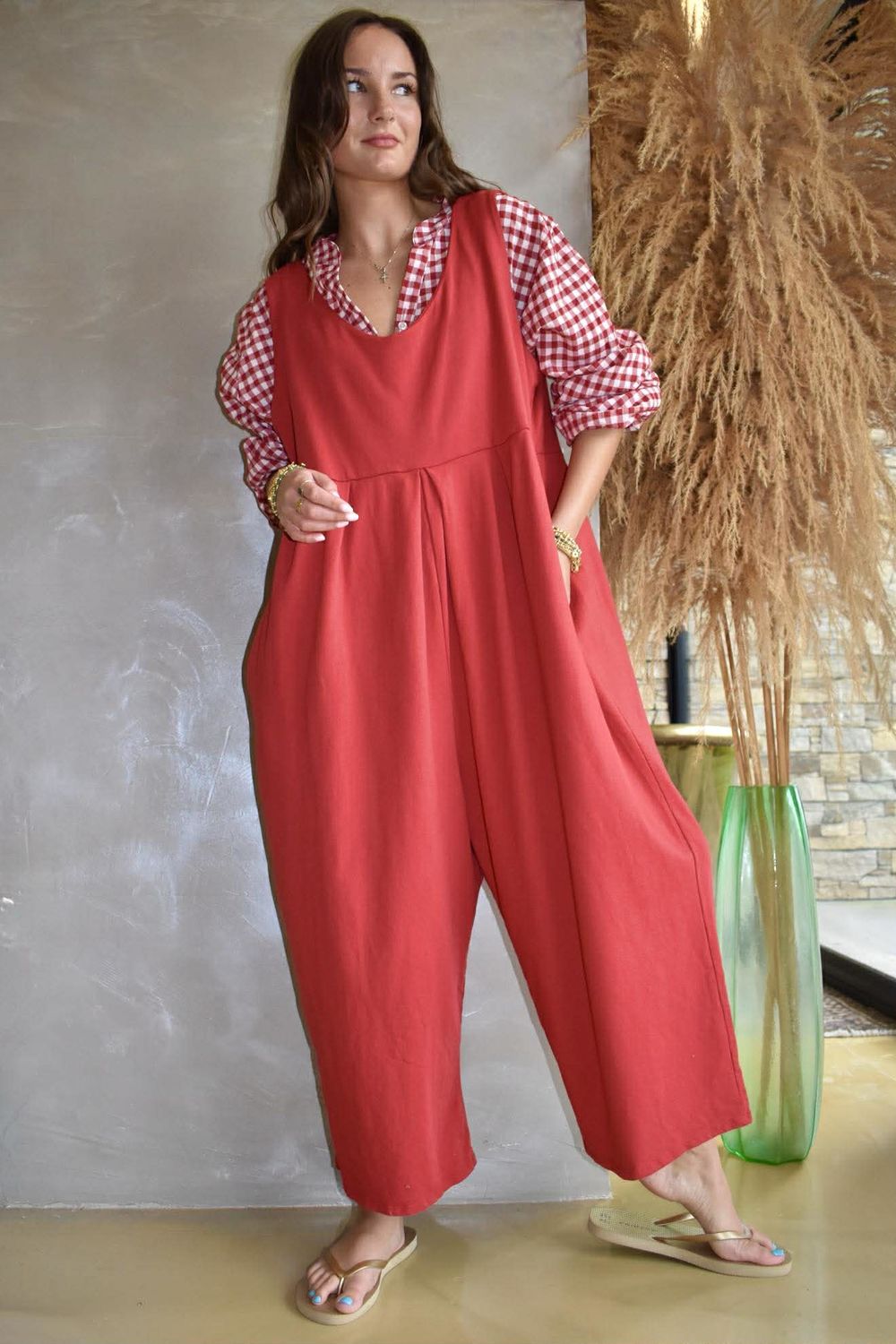 - Women's one-size jumpsuit in Sangria — a rich, vibrant red with warm, jewel-like undertones. Bold yet versatile, it’s perfect for all-year-round wear and pairs beautifully with neutrals, earthy shades, and deeper tones for a striking, effortless look.