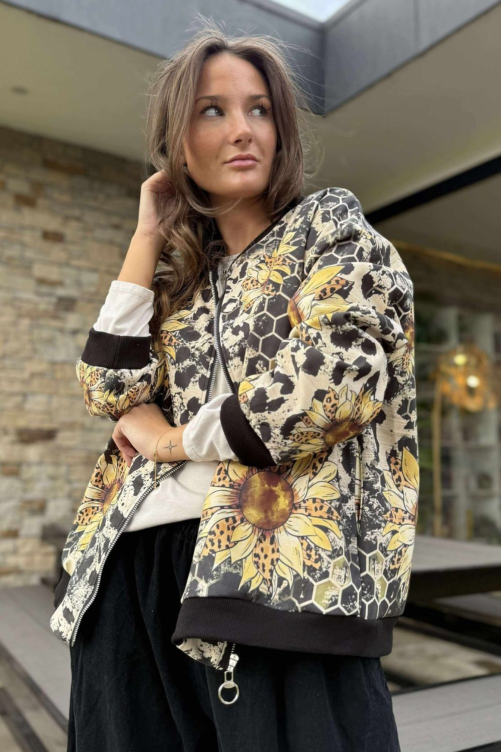 This is a must for elevating your everyday style with this Suko Suedette Bomber Jacket, designed in a luxuriously soft faux suedette fabric that’s perfect for wearing all year round. The bold Sunflower and honeycomb print makes it a true statement piece, while the contrasting stretch collar and cuff detailing add an edgy, modern twist. A versatile layer that blends comfort and style, making it easy to dress up or down.