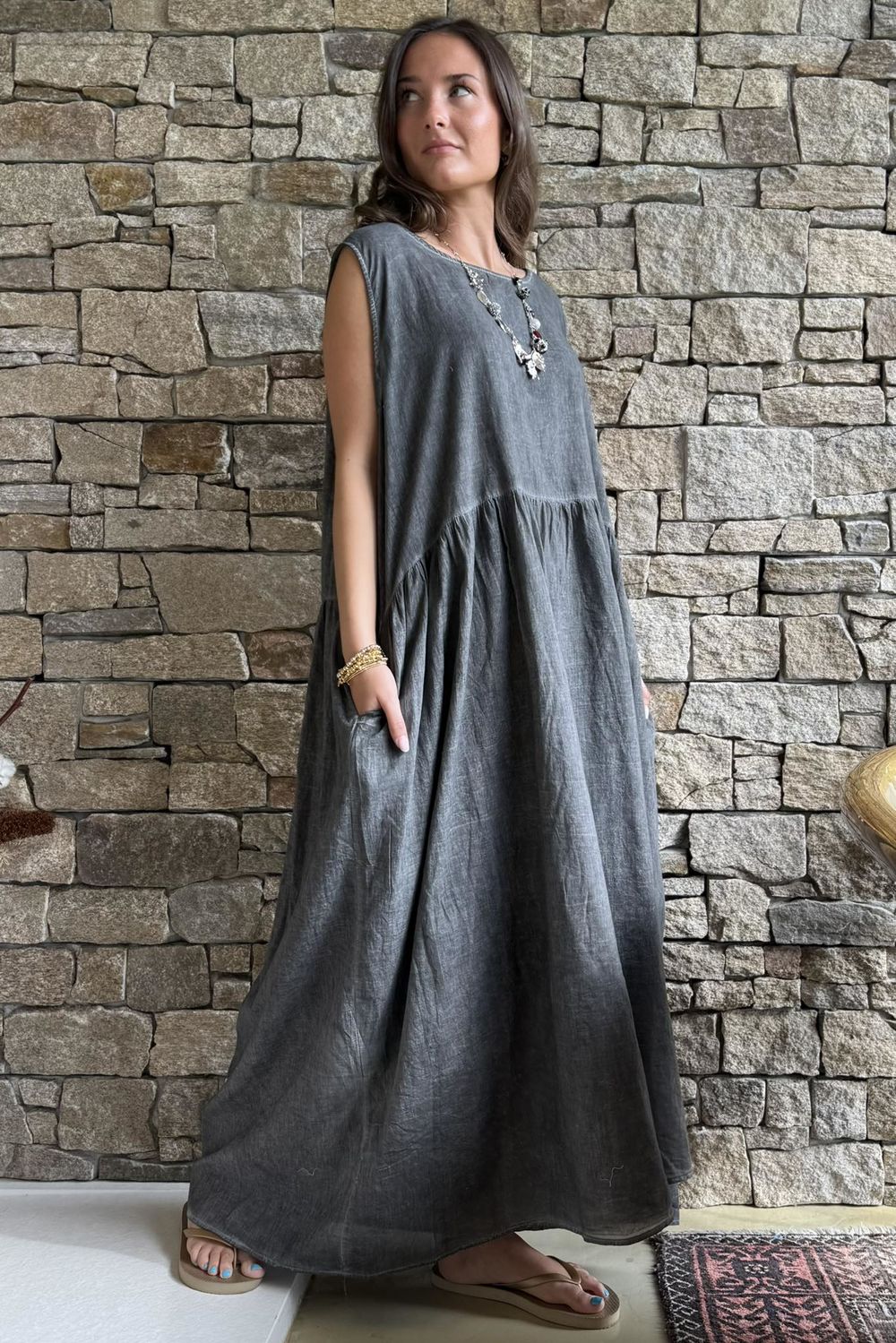 Sleeveless in design, this piece is perfectly suited to warm-weather dressing, yet versatile enough for transitional layering—making it a timeless addition to a considered, modern wardrobe.