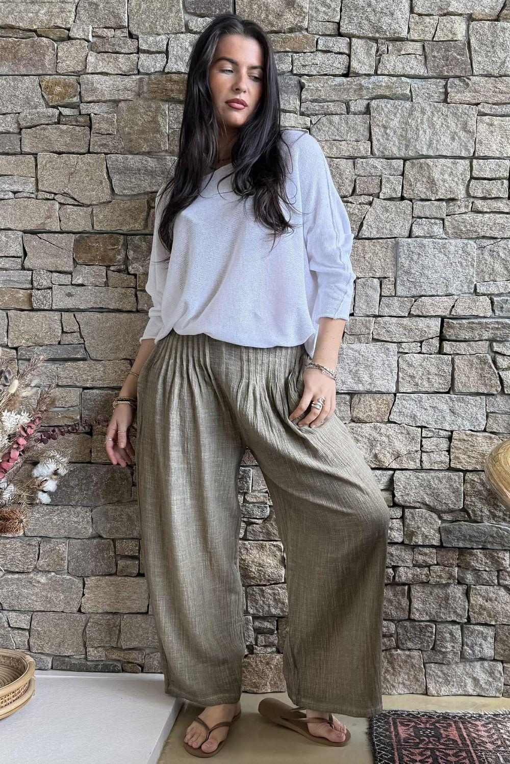 Colour: washed earth, these trousers can be styled with the matching smock blouse for an effortless set, or paired with one of our best-selling Conrad summer layering knits—they’ll quickly become the go-to trousers you reach for again and again.