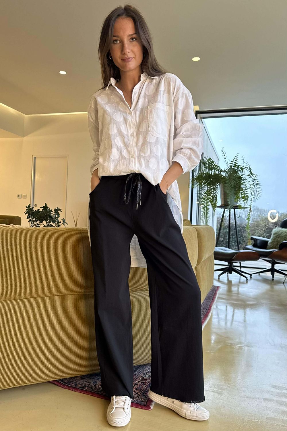 Ladies these trousers will change your life: our in-house designed Raw Kick Marine Luxe Magic Trousers in Black from made in Italy clothing are a must-have style in all wardrobes. These super stretch wide leg trousers, have been designed to effortlessly flatter your figure while providing ultimate comfort. Plus, the genius raw hemline offers a customisable length, just chop to your preferred style for a perfect, personalised fit.