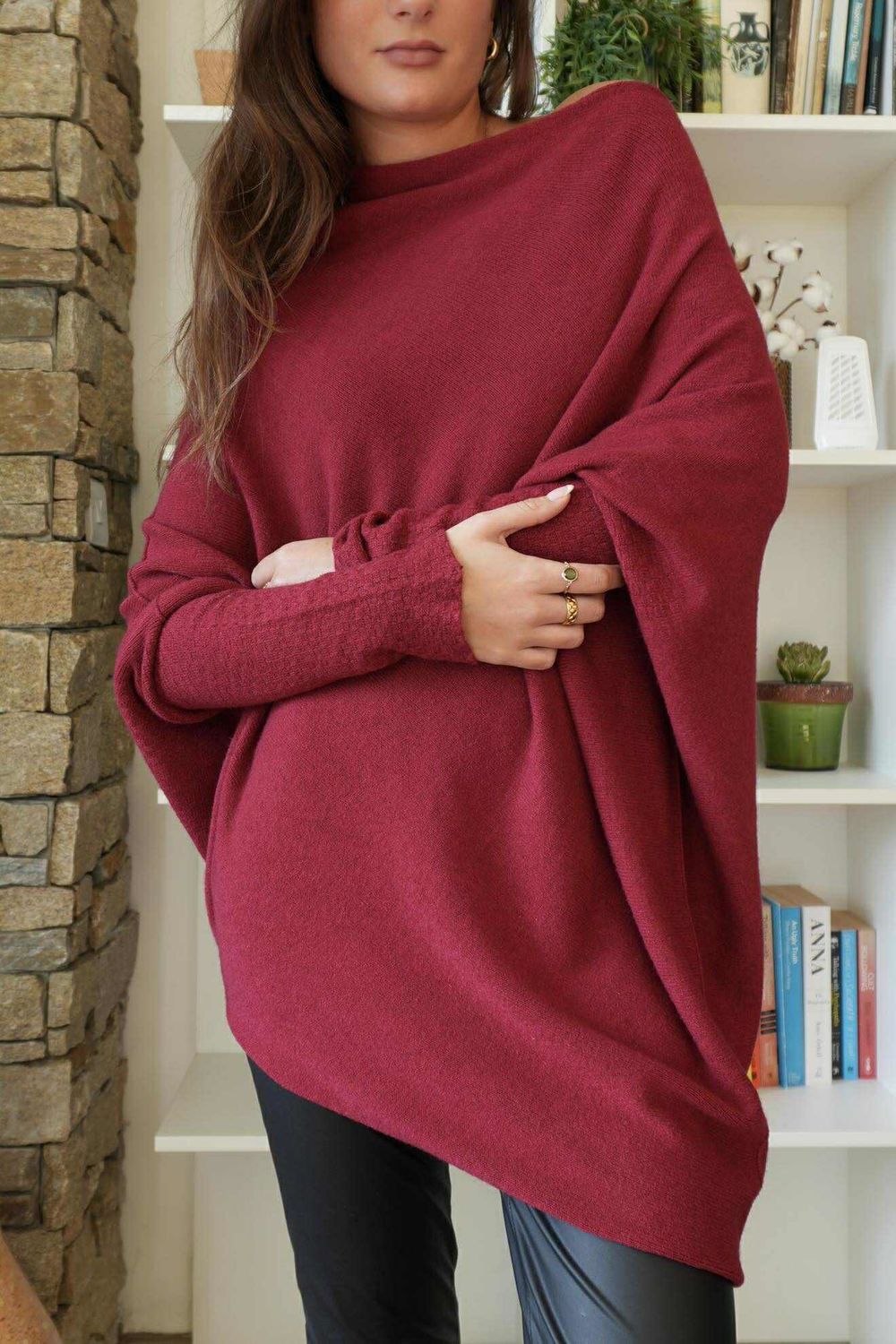 Say hello to your new wardrobe staple! Our made in Italy huggle asymmetric draped knit jumper in burgundy red is the ultimate knitwear must-have for ladies who love versatility and style. With its quirky asymmetric shape, this one-size piece flatters every figure, draping effortlessly in all the right places. What sets it apart from other women's knitwear? Its multi-way wear feature, style it off the shoulder for a laid-back look, turn it into a chic cowl neck for everyday wear, flip it upside down for a whole new silhouette, or keep it bold with a one-shoulder for an evening look. From cosy coffee dates with friends to dressed up evenings, this jumper is the perfect fit for any occasion.
