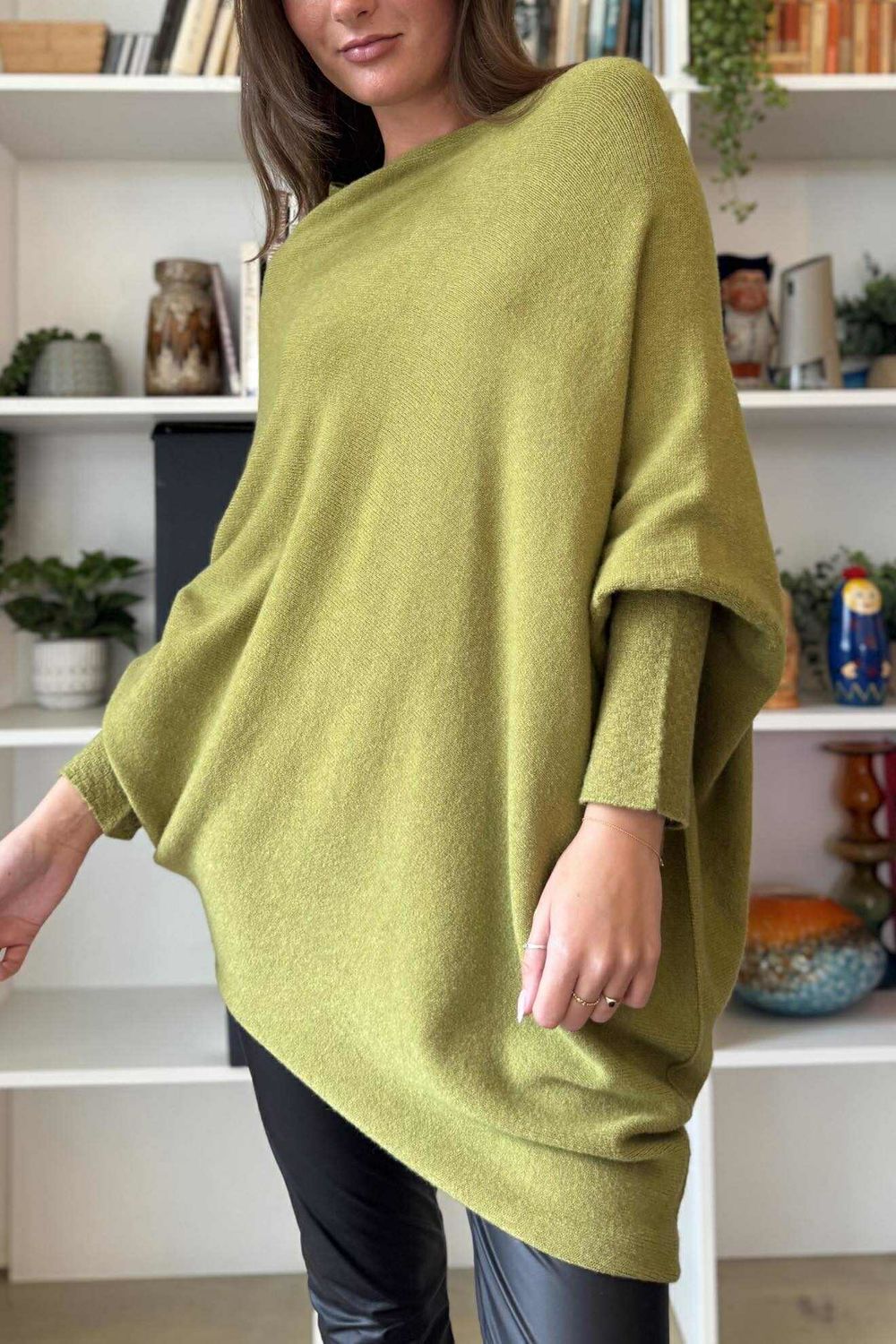Say hello to your new wardrobe staple! Our made in Italy hugle asymmetric draped knit jumper in moss green is the ultimate knitwear must-have for ladies who love versatility and style. With its quirky asymmetric shape, this one-size piece flatters every figure, draping effortlessly in all the right places. What sets it apart from other women's knitwear? Its multi-way wear feature, style it off the shoulder for a laid-back look, turn it into a chic cowl neck for everyday wear, flip it upside down for a whole new silhouette, or keep it bold with a one-shoulder for an evening look. From cosy coffee dates with friends to dressed up evenings, this jumper is the perfect fit for any occasion.