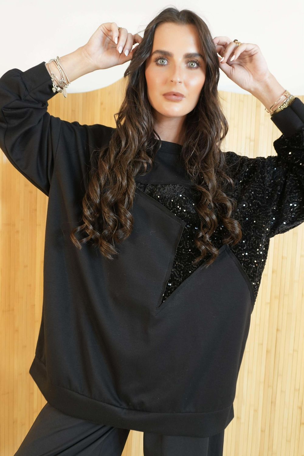 - Classic sweatshirt silhouette meets modern glamour—perfect for day-to-night dressing.