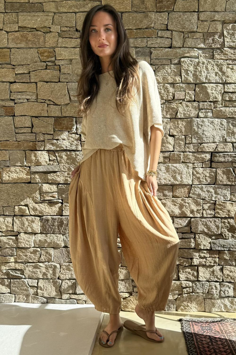 - Women's one-size barrel pants in honey bronze