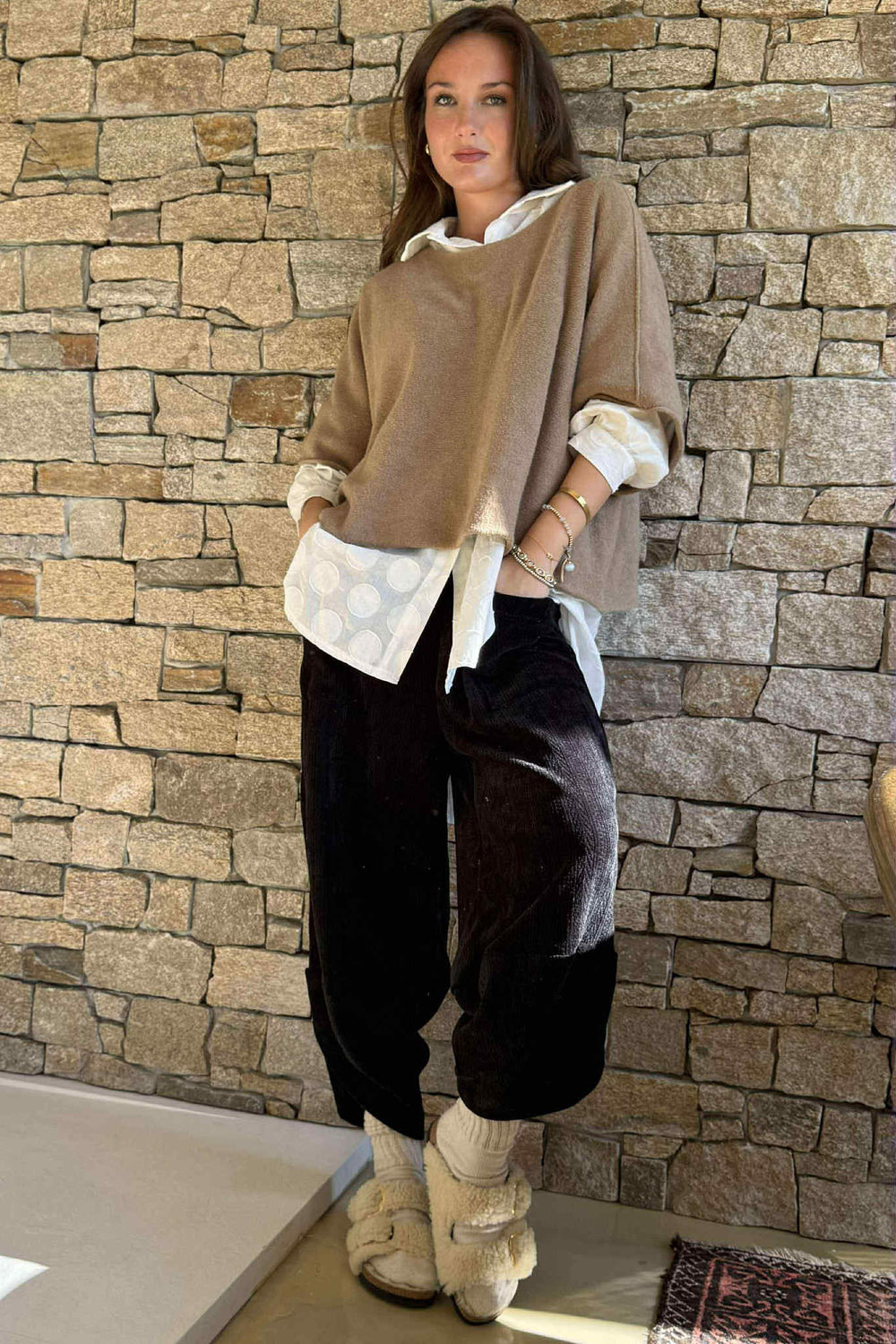 Wrap yourself in comfort with our one-size women’s trousers, crafted from super soft stretch velours with a subtle linear texture that feels as good as it looks. Designed with relaxation in mind, these trousers feature a soft stretch waistband for effortless wear and handy pockets to keep your hands warm, adding to the cosy appeal. Perfect for chilling out, this style captures the essence of hygge living, bringing the ultimate cosy feeling to your autumn-winter wardrobe.