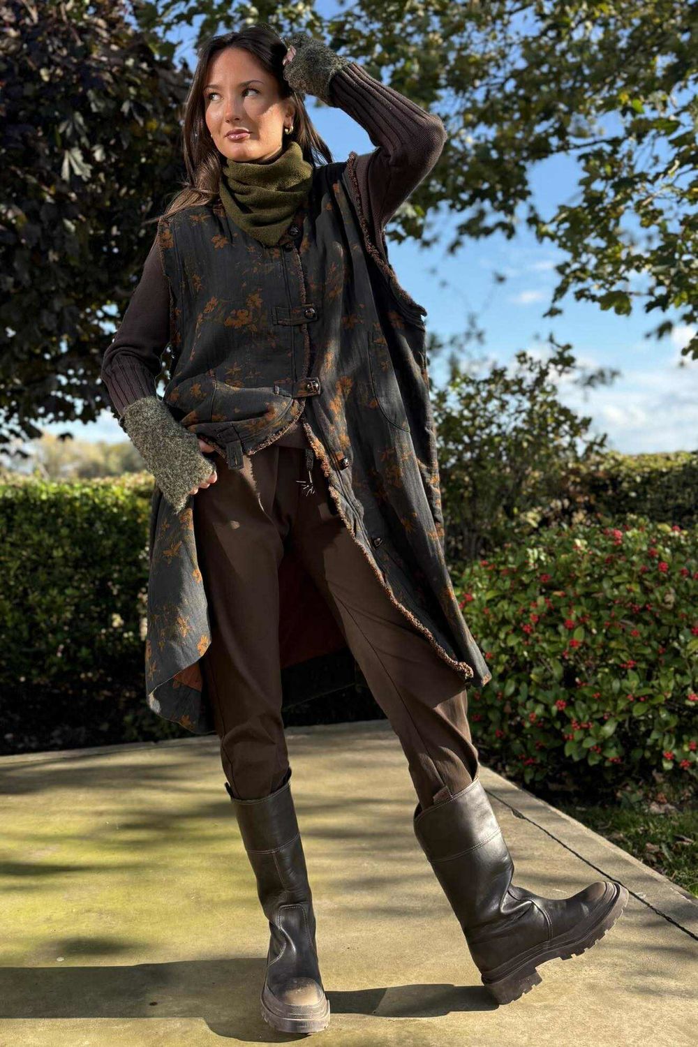 Embrace the season in style with our sleeveless gilet, the perfect layering piece for effortless autumn dressing. Made from super-soft 100% cotton, this gilet combines comfort and breathability. The folklore-inspired print features contrasting autumnal colours, bringing warmth and character to any outfit. Frayed, raw-edged detailing along the neckline and arms gives it a relaxed, rustic finish, while front knot buttons add a charming, vintage- touch. Complete with two practical patch pockets making it a versatile statement piece for your autumn and winter wardrobe.