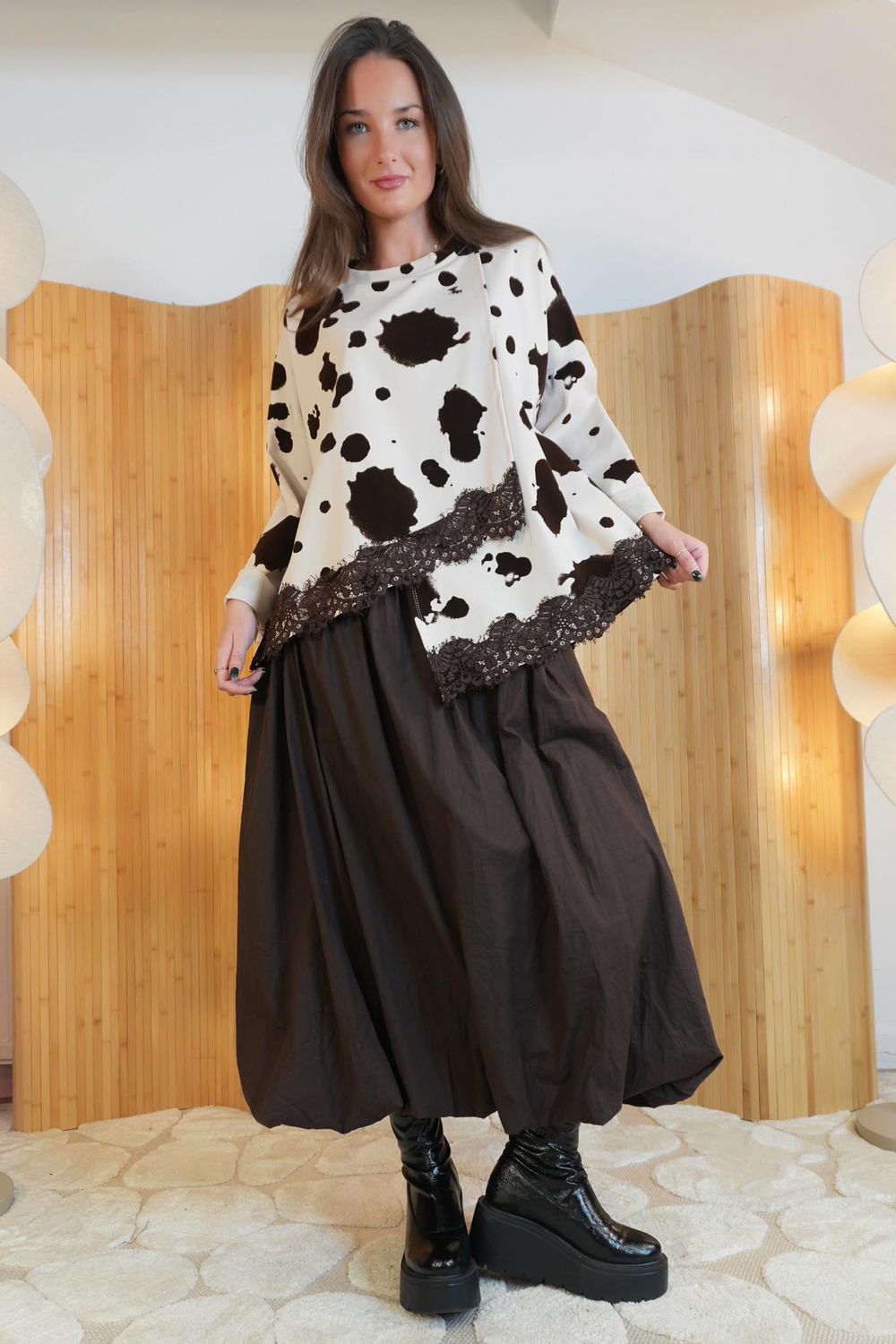 Crafted from premium scuba fabric with a rich chocolate brown flock print, this top brings texture, depth, and a dressy feel that makes it perfect for elevating any occasion. The asymmetric hem, finished with delicate lace detailing, adds that signature Laundry B touch.