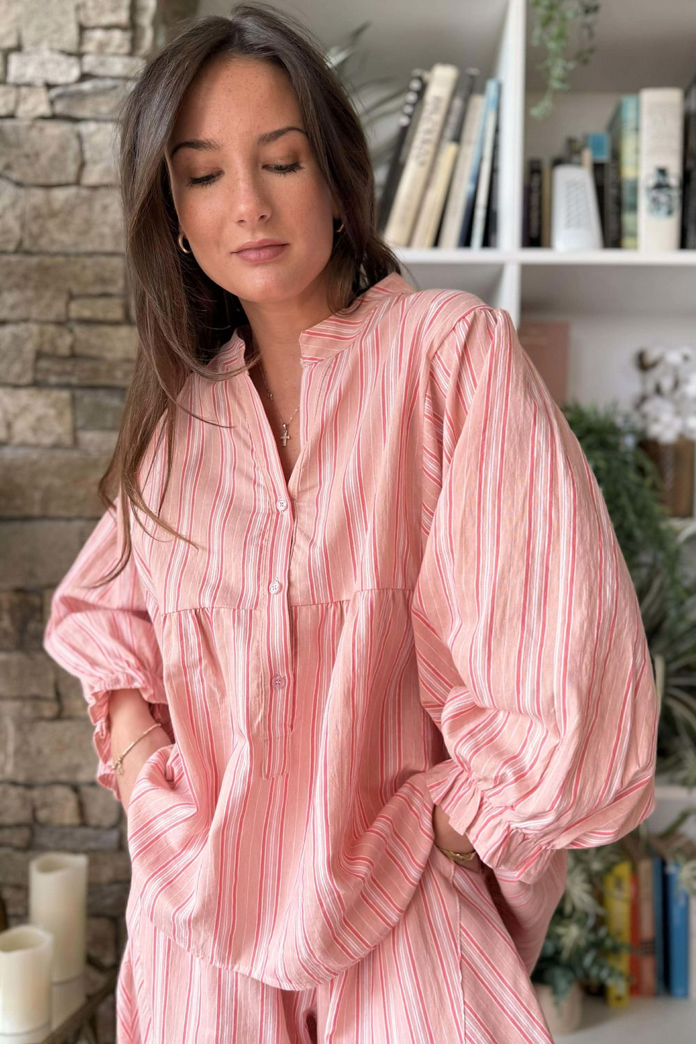 - Women's one-size blouse in Shrimp, a soft, warm pink with subtle coral undertones—sun-kissed, easy, and quietly playful.