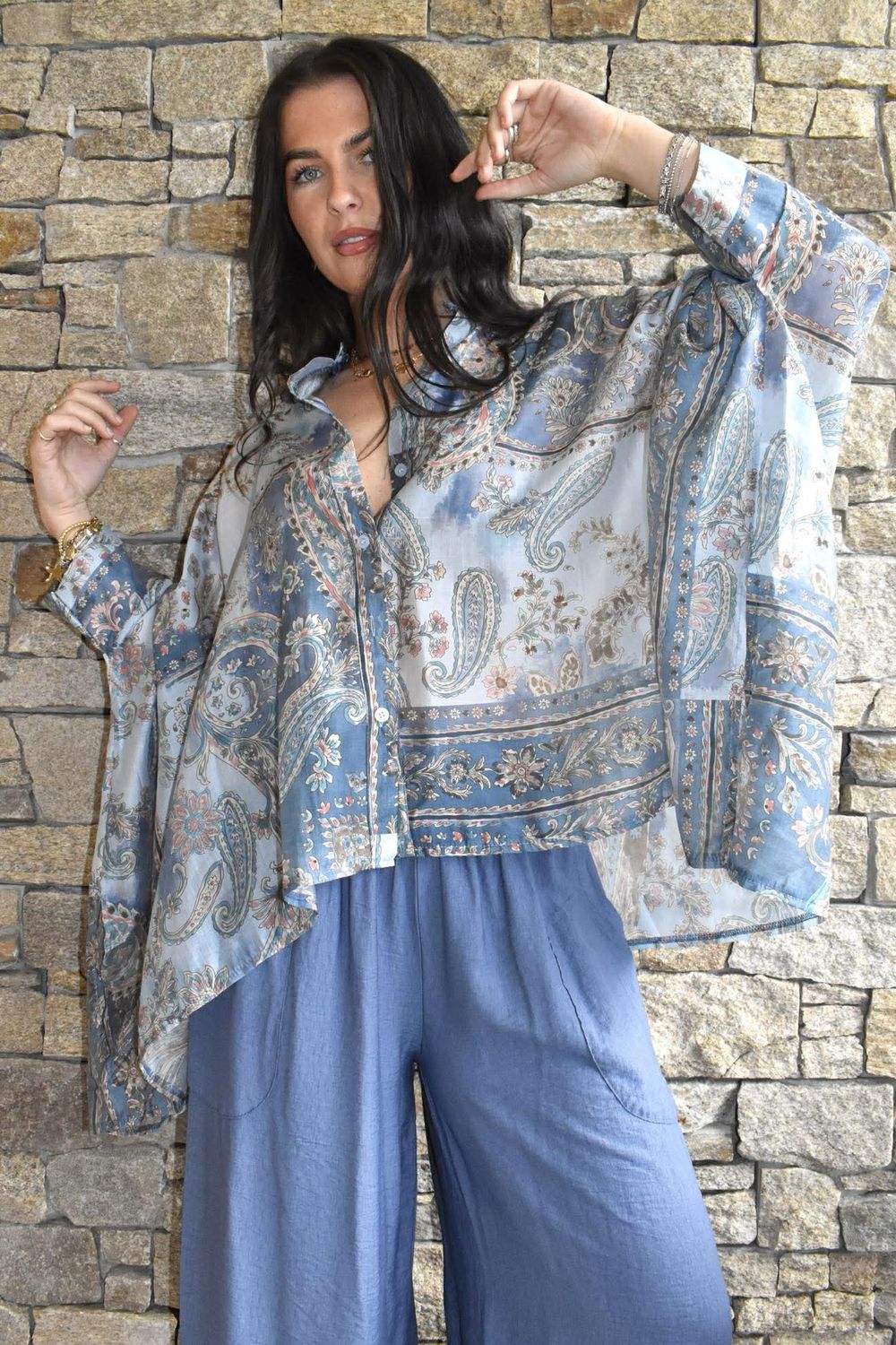 Showcasing a striking paisley print, the blouse brings an artistic, statement-making edge to your wardrobe. A soft drop shoulder flows into bangle-length sleeves, finished with cuffs that introduce a subtle sense of structure, balancing the piece’s natural fluidity with a tailored touch. Completed with a delicate button fastening, it blends practicality with understated sophistication.