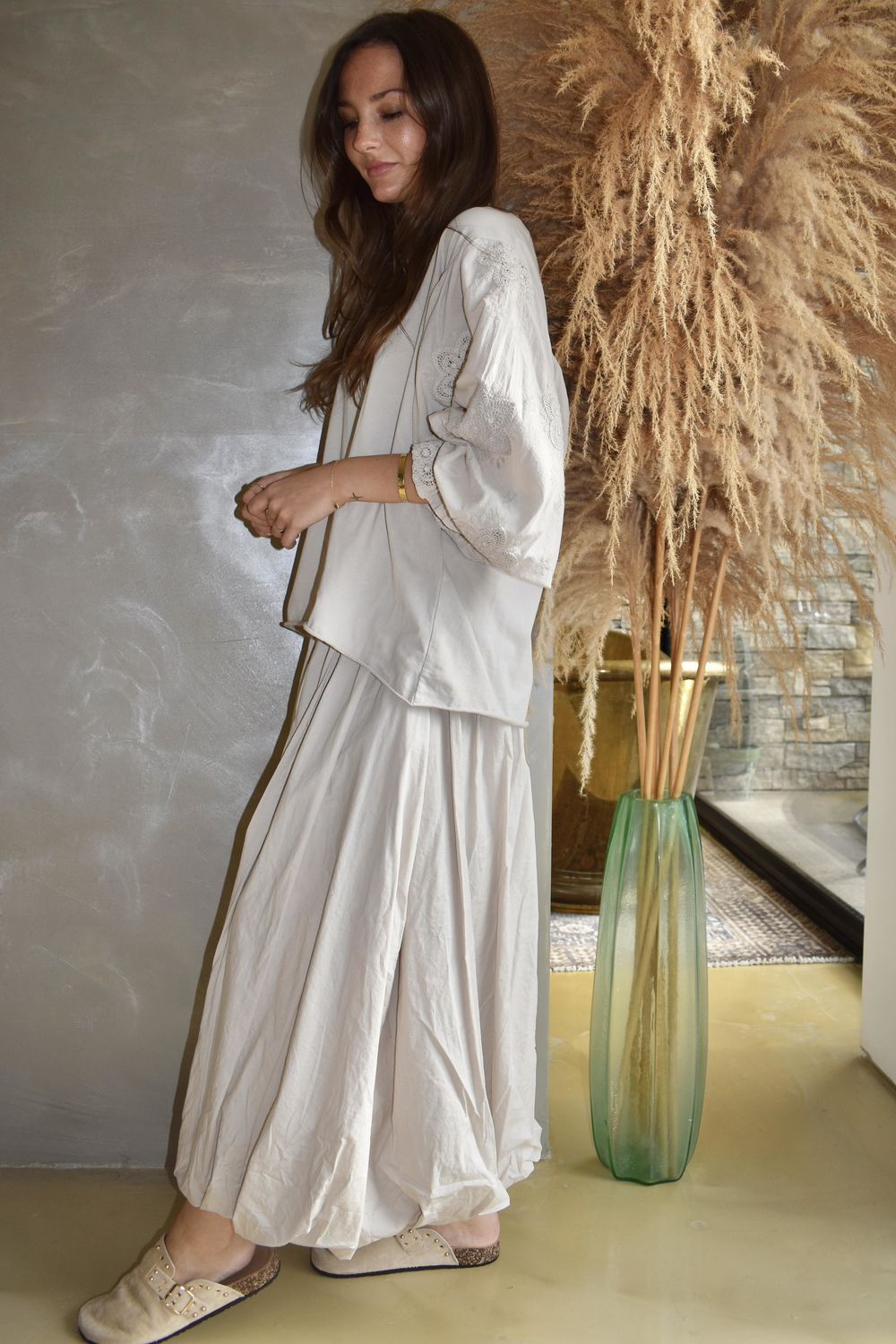 Elevate your everyday wardrobe with our Paloma Top, a modern silhouette inspired by romantic vintage dressing and contemporary fashion styling, slips into your wardrobe to wear with pieces from our Lagen or Paloma collection. Made from lightweight stretch pure cotton jersey, the body offers breathable comfort with a flattering, easy drape. The classic round neckline keeps the shape timeless — a nod to traditional wardrobe staples that form the foundation of effortless style. The dramatic batwing sleeves draw inspiration from Victorian and Edwardian-era shirting, where volume and detail were key design features. Made from structured shirting cotton, they create a beautiful contrast against the soft jersey body. The shirring elasticated cuff, finished with a gentle frill hem, allows you to style the sleeve with as much volume and drama as you desire — echoing the romantic sleeve revival seen across modern fashion collections. Intricate crocheted cotton floral appliqué and subtle tonal embroidery pay homage to traditional handcraft techniques, celebrating texture and artisanal detail. These delicate embellishments add depth and dimension while maintaining a refined, understated finish — perfectly balancing femininity with everyday wearability.