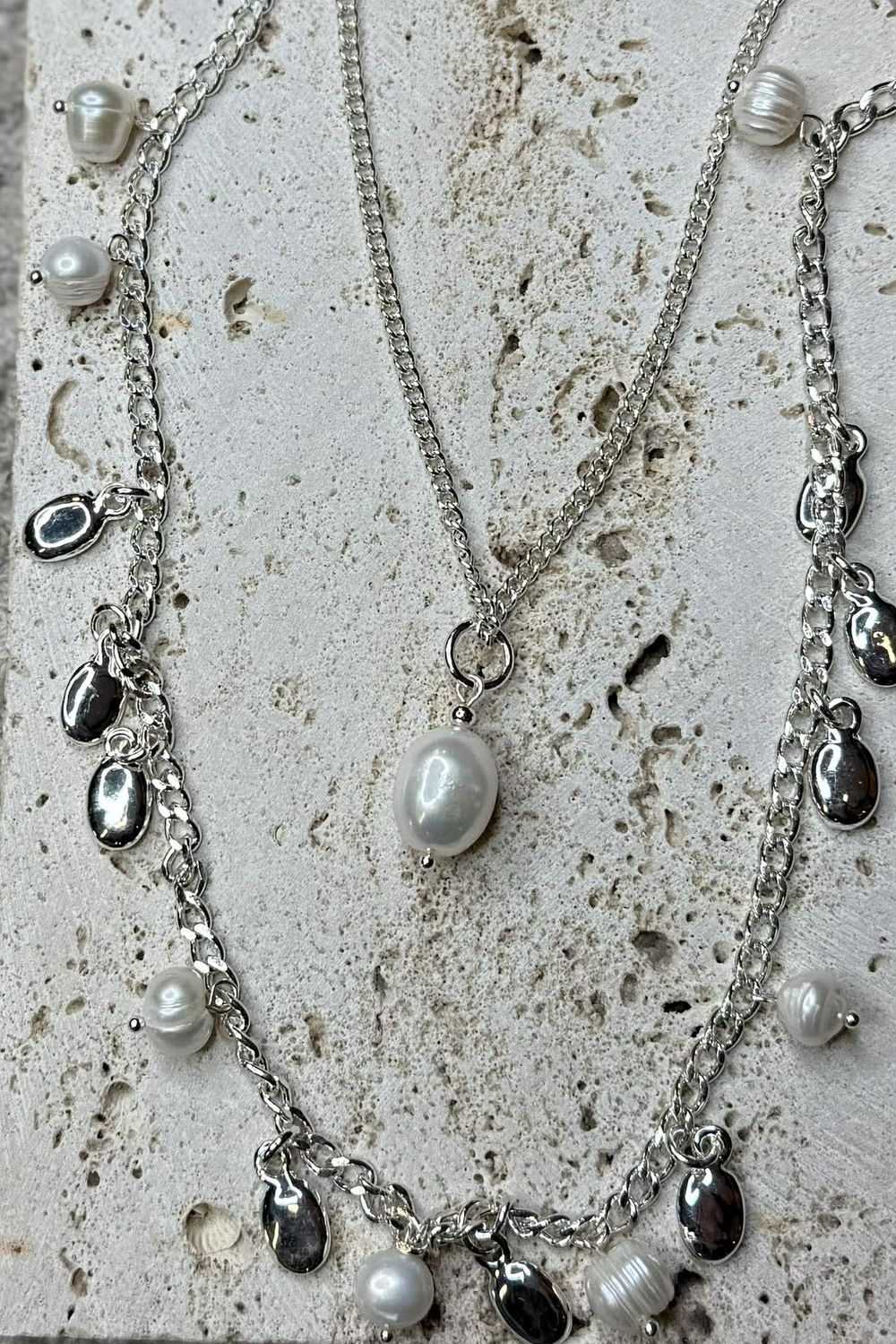- With a pearl and molten silver droplet pendents on the chain of the necklace.