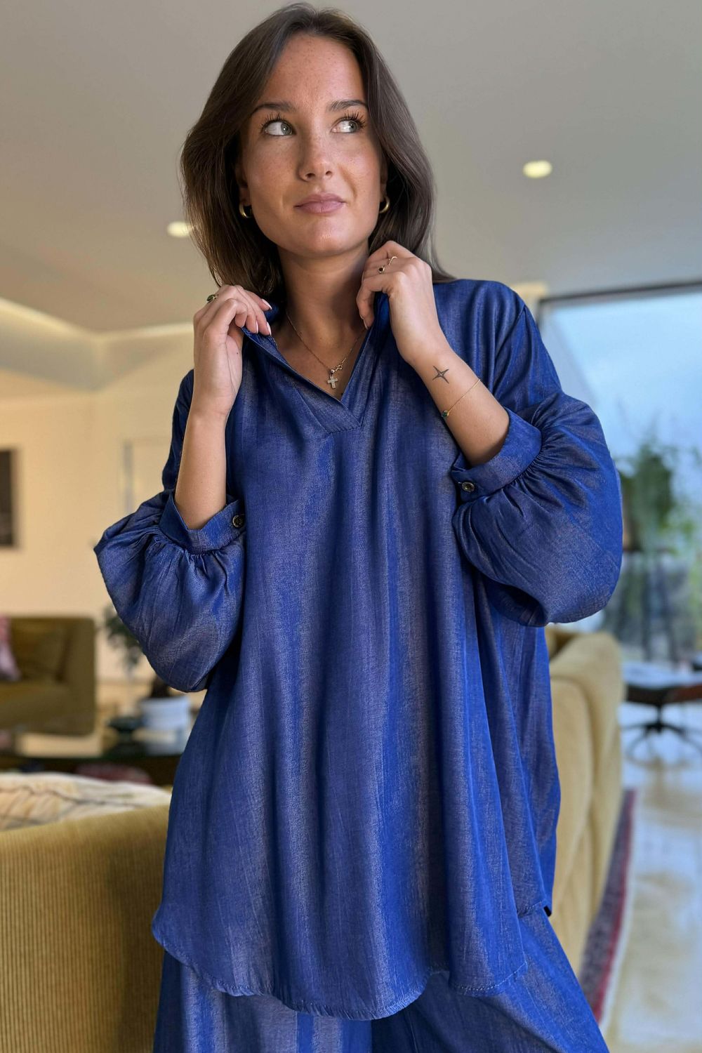 - This piece is made from a lightweight, fluid chambray denim that feels soft against the skin, none of the stiffness of traditional denim.