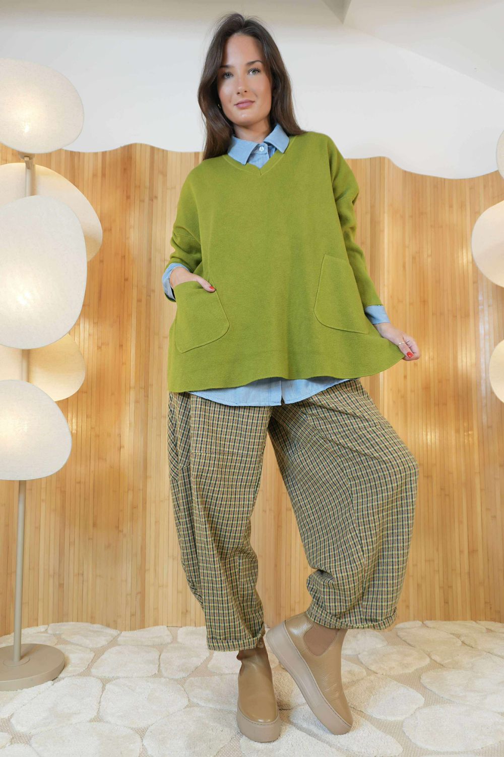 Featuring two front pockets perfectly positioned for slipping your hands into, this cosy knit blends practicality with charm. The luxuriously v neckline sits perfectly for one of our neckerchiefs, adding a touch of elegance to your everyday wardrobe. Finished with soft, stretch long sleeves and a flattering straight hemline with a split side, this versatile piece is perfect for layering and elevating your look throughout the seasons.