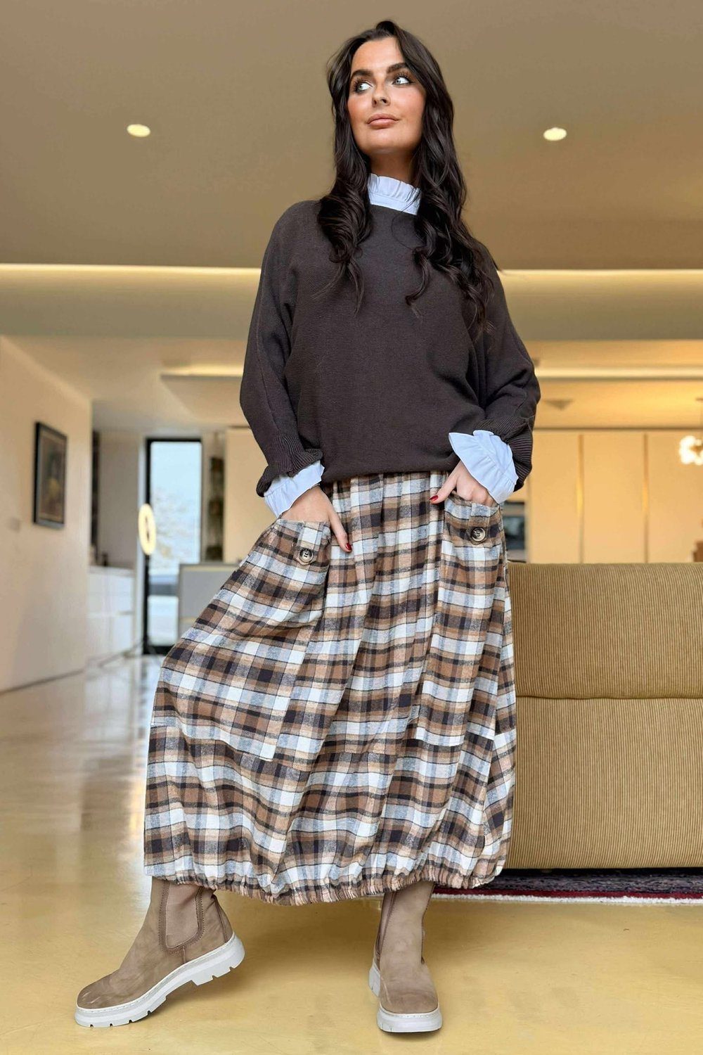 Meet Roberta the beautiful sister of Patrick and Donald! She is effortlessly stylish and endlessly wearable, this one-size skirt is crafted from breathable, lightweight plaid brished cotton that drapes beautifully and feels soft against the skin — perfect for transitional dressing or layering throughout the seasons. Cut in a bubble silhouette, the skirt features an elasticated hemline that adds just the right amount of volume at the calf for a flattering, modern shape. The smooth, stretch waistband ensures a comfortable and flexible fit, offering all-day ease without compromising on style. Thoughtful pockets with button detailing bring subtle charm and everyday practicality without adding bulk. Roberta can be worn on her own styled with pieces from your Laudnry B wardrobe or with her counterpart cape for that stand out LB look we all love.