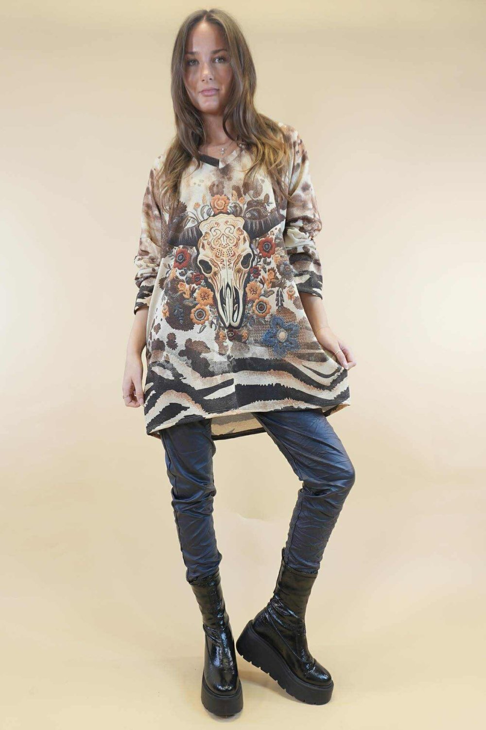 Turn heads in this one-size women’s top, featuring a Bison boho inspires print for that effortless bohemian look. Designed to blend comfort with statement style, it showcases a flattering V neckline and the relaxed silhouette flows effortlessly. Woven with a delicate gold lurex thread throughout, this top offers a glamorous finish that elevates your everyday dressing. Perfect for throwing on and feeling fabulous—no effort required.