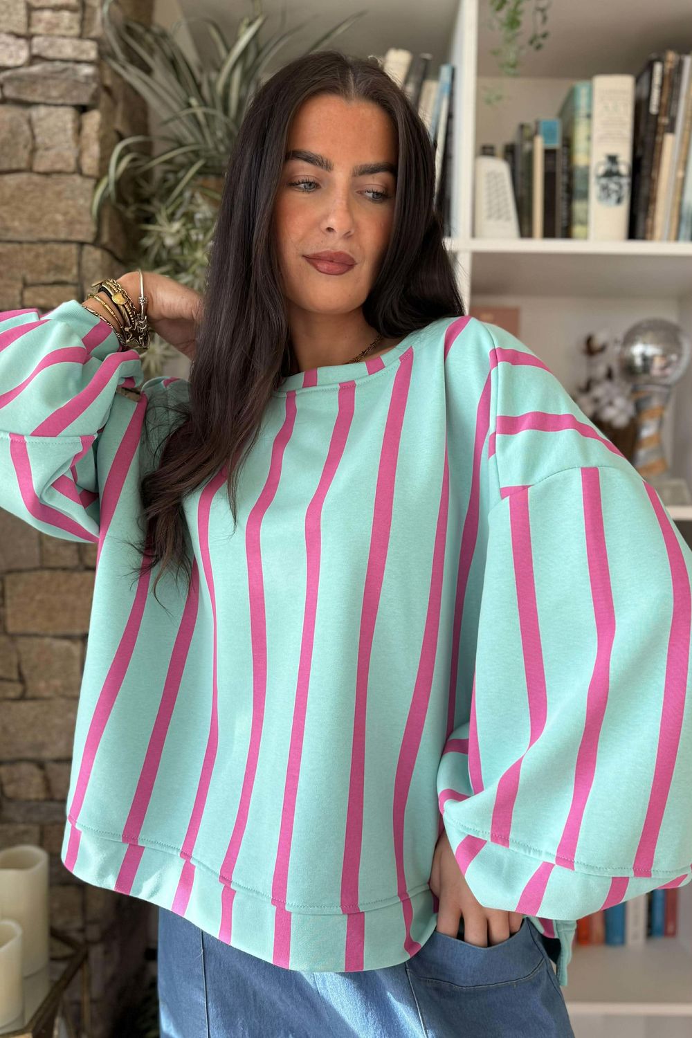 - Women's one-size sweatshirt in sage, accented with bold, hot pink vertical stripes that add a playful, eye-catching twist to its soft, calming hue.