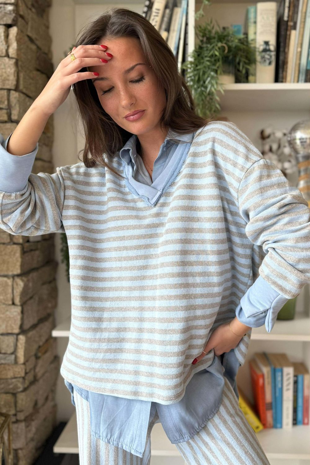 Our Shoreditch Slouch Sweatshirt jumper is available in blue and grey. Designed with a relaxed, classic sweatshirt silhouette, it’s perfect for throwing on or layering over one of our essential tops. The playful contrasting stripe detail adds a fun pop of colour, while the practical, easy-wear design makes it ideal for everyday use. Finished with a flattering v neckline, this sweatshirt styles effortlessly with our scarves and neckerchiefs for a laid-back yet considered look. Style with the Shoreditch Lounge Flare Pant or with a barrel leg pant, depending on the look you are after.