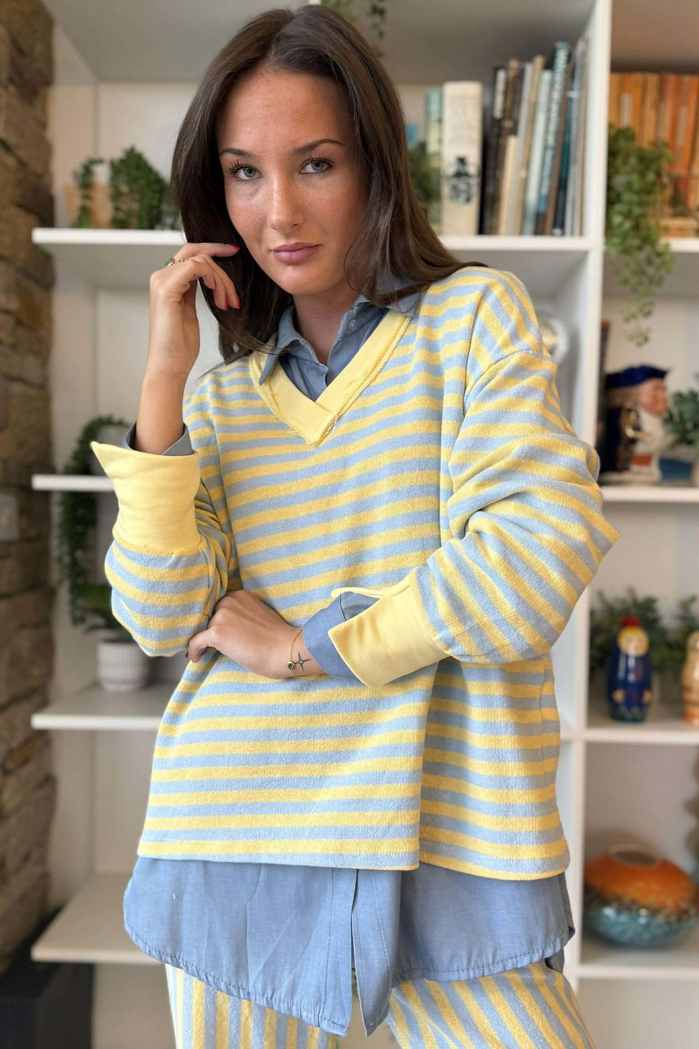 Our Shoreditch Slouch Sweatshirt jumper is available in blue and grey. Designed with a relaxed, classic sweatshirt silhouette, it’s perfect for throwing on or layering over one of our essential tops. The playful contrasting stripe detail adds a fun pop of colour, while the practical, easy-wear design makes it ideal for everyday use. Finished with a flattering v neckline, this sweatshirt styles effortlessly with our scarves and neckerchiefs for a laid-back yet considered look. Style with the Shoreditch Lounge Flare Pant or with a barrel leg pant, depending on the look you are after.