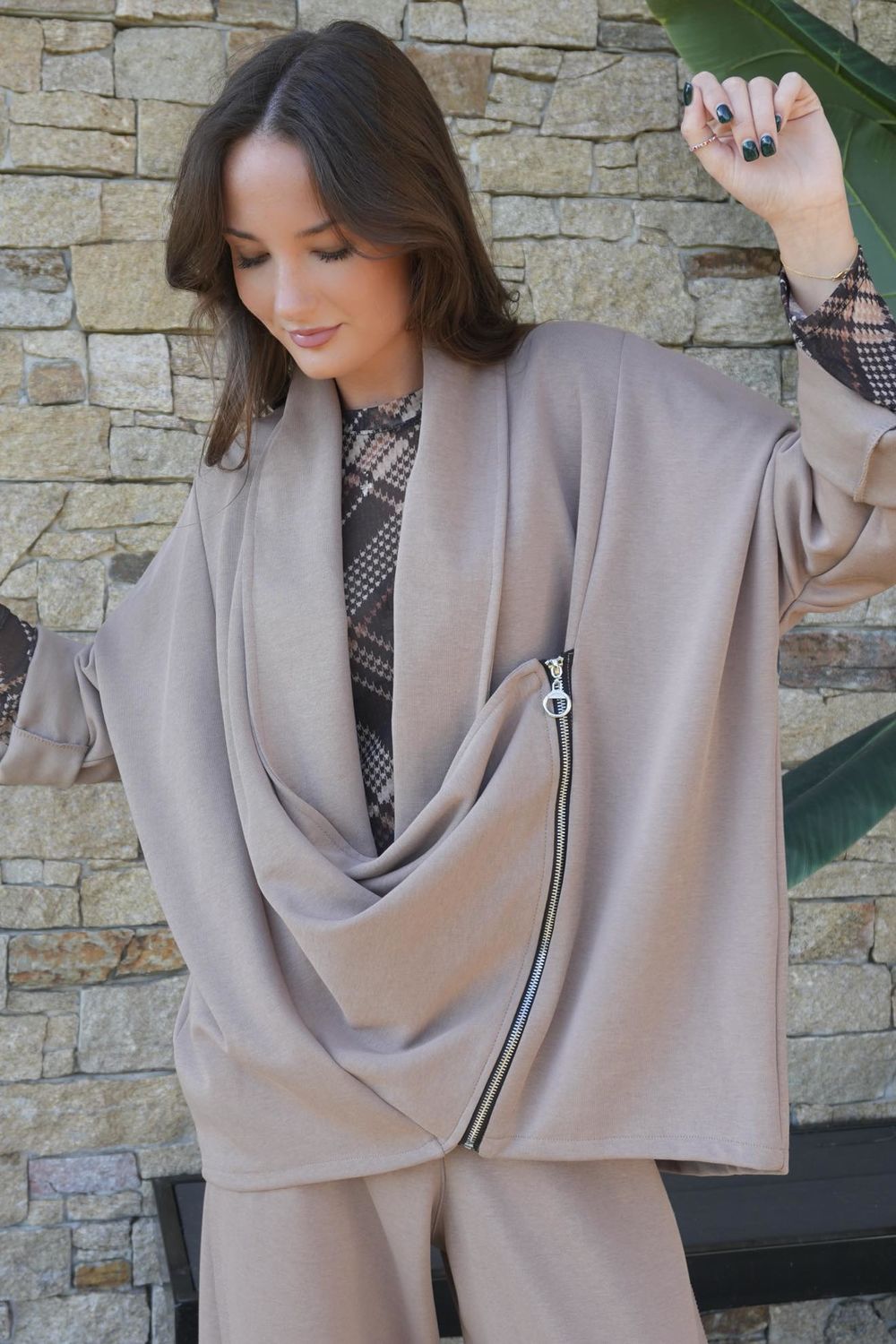 Say hello to the jacket that turns even the simplest outfit into something special. Crafted from a smooth, stretchy performance fabric, it moves with you and feels incredible from morning to night—while still looking chic and put-together. The shape gives a cool, understated biker vibe with a soft, fluid front that falls in sculptural folds, creating that effortless “I just threw this on” sophistication. A striking slanted zip and statement pull bring a touch of modern attitude, making it a piece that stands out without trying too hard. Light, breathable, and ideal for layering, it’s the kind of hero jacket you’ll wear year-round. And because it’s part of a four-piece sports-luxe capsule, it pairs seamlessly with the rest of the collection for endless, easy outfit options.