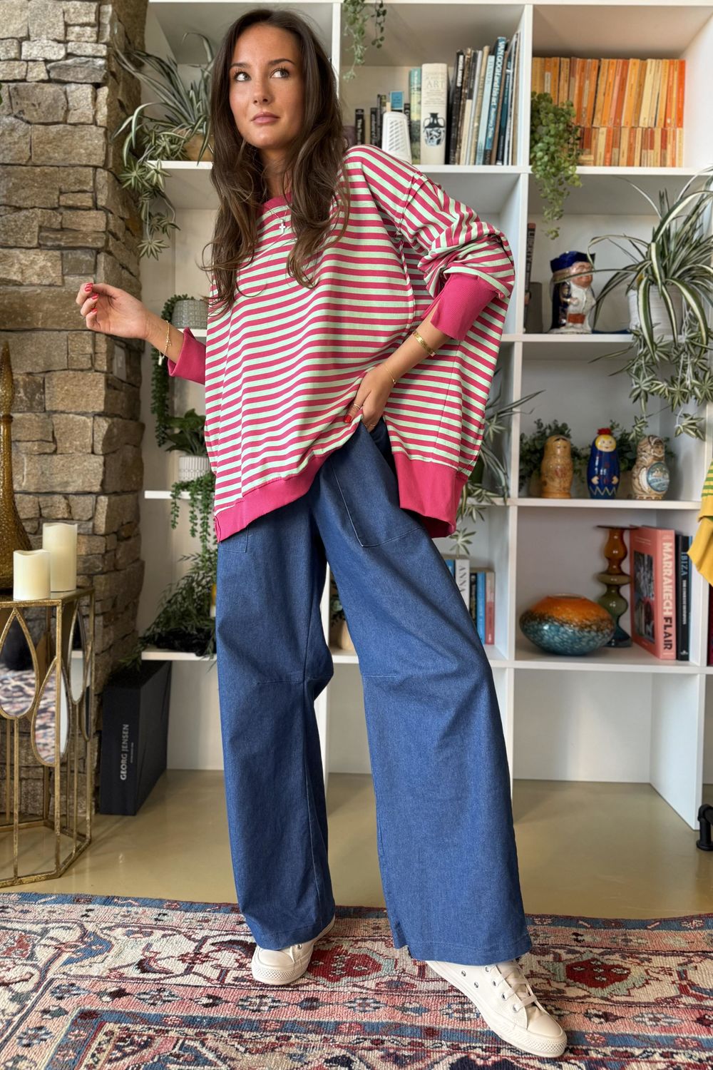 Meet your ultimate go-to sweatshirt, the Made in Italy Sunday Morning Chill Sweatshirt, a timeless wardrobe staple adorned with a classic breton stripe in playful pink-and-mint colors. Made from 100% premium cotton, it’s beautifully lightweight and breathable, making it the perfect piece to carry you through every season. Subtle design details, like raw seams, split hemlines, and a relaxed, slouchy fit, give it that effortless edge we all love. Style it with your favorite Laundry B denim, or have fun and print-clash with a plaid or leopard-print demi bloom trouser for a bold, playful look.