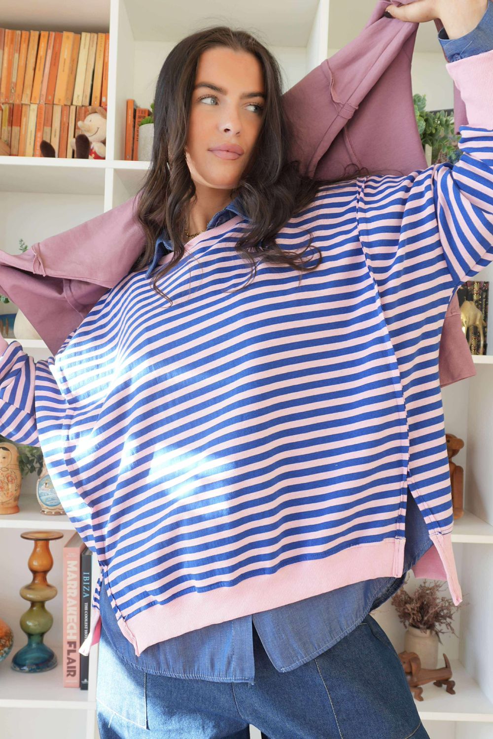 Meet your ultimate go-to sweatshirt, the Made in Italy Sunday Morning Chill Sweatshirt, a timeless wardrobe staple adorned with a classic breton stripe in playful brown-and-mint colors. Made from 100% premium cotton, it’s beautifully lightweight and breathable, making it the perfect piece to carry you through every season. Subtle design details, like raw seams, split hemlines, and a relaxed, slouchy fit, give it that effortless edge we all love. Style it with your favorite Laundry B denim, or have fun and print-clash with a plaid or leopard-print demi bloom trouser for a bold, playful look.