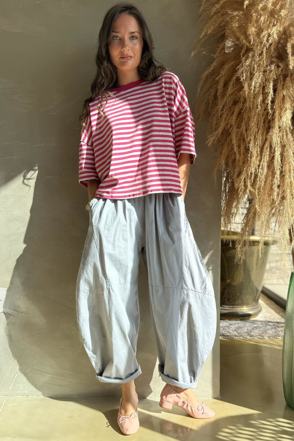 Meet your ultimate go-to tee, the Made in Italy Sunday Morning Tee, a timeless wardrobe staple adorned with a classic breton stripe in playful pink and grey tones. Made from 100% premium cotton, it’s beautifully lightweight and breathable, making it the perfect piece to carry you through every season. Subtle design details, like raw seams, split hemlines, and a relaxed fit, give it that effortless edge we all love. Style it with your favorite Laundry B denim, or have fun and print-clash with a plaid or leopard-print demi bloom trouser for a bold, playful look.