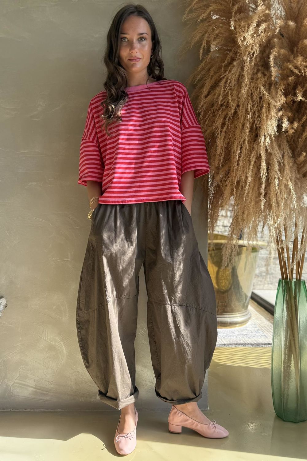 Meet your ultimate go-to tee, the Made in Italy Sunday Morning Tee, a timeless wardrobe staple adorned with a classic breton stripe in playful hot pink and red tones. Made from 100% premium cotton, it’s beautifully lightweight and breathable, making it the perfect piece to carry you through every season. Subtle design details, like raw seams, split hemlines, and a relaxed fit, give it that effortless edge we all love. Style it with your favorite Laundry B denim, or have fun and print-clash with a plaid or leopard-print demi bloom trouser for a bold, playful look.