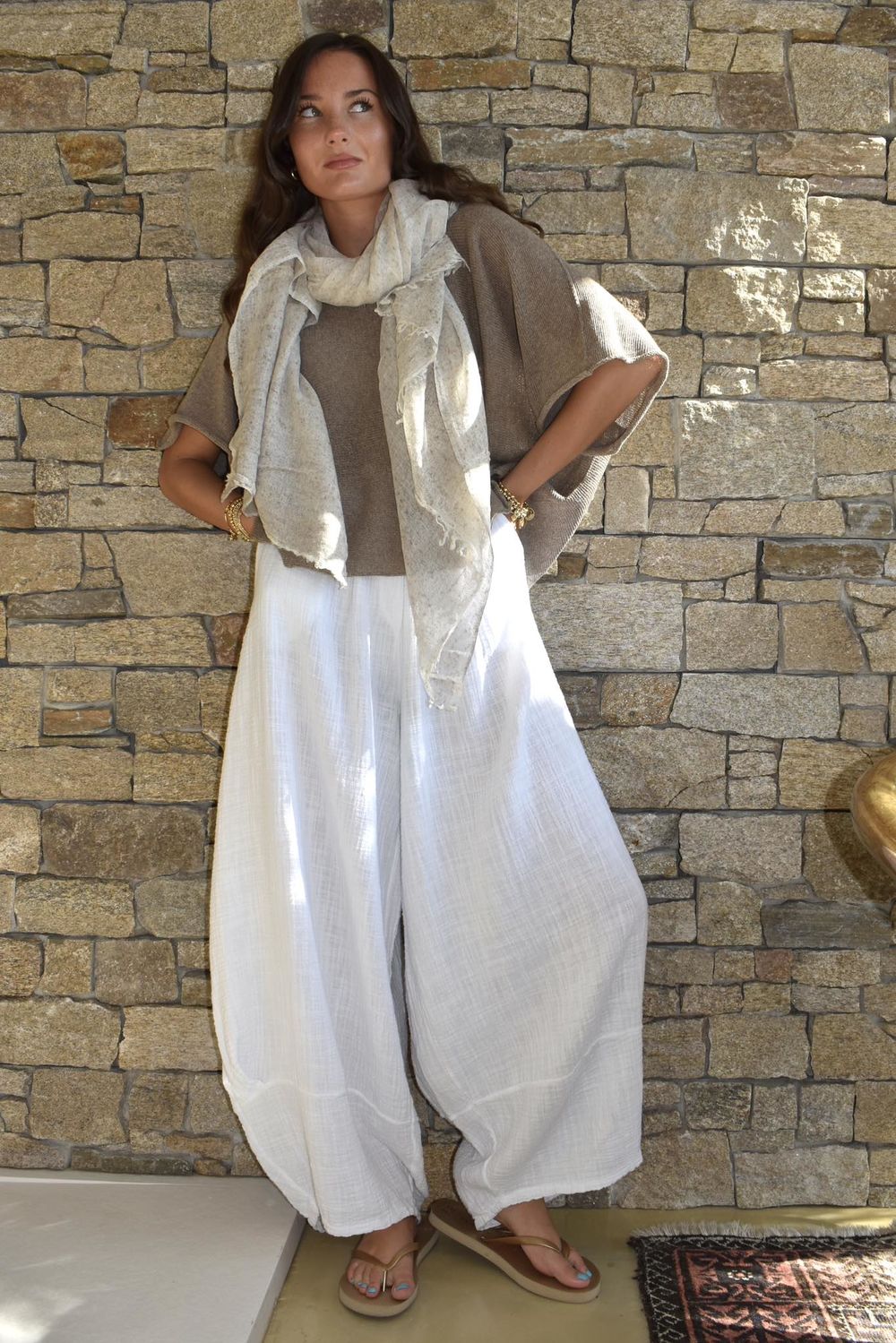 Made from beautifully soft, textured cushion cotton, these trousers offer a naturally breathable feel with 100% cotton at their core—light, airy, and endlessly comfortable. The relaxed balloon barrel silhouette creates a modern, easy shape, gently tapering to a cuff that can be styled rolled up or worn full length for versatile, everyday wear. Designed with a softly elasticated waistband, they provide a flattering, flexible fit that moves with you while maintaining a refined look. Thoughtful seam detailing adds subtle structure, while functional pockets bring a contemporary, practical edge. Perfectly suited to boho summer styling, these trousers pair effortlessly with pieces from the collection or crochet Ibiza-inspired layers for a beautifully coordinated look—or stand alone as a statement of relaxed elegance.