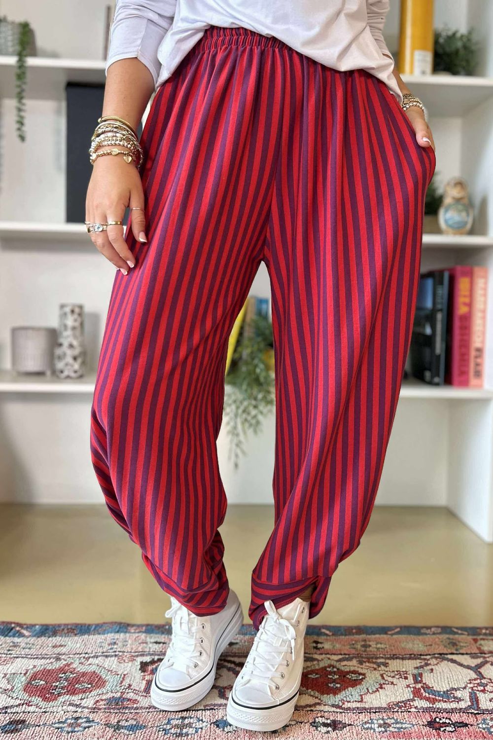 The Sunday Morning Stripe Twist Pant is the ultimate blend of comfort, cool, and quiet confidence. Designed in a soft cotton jersey with just the right amount of stretch, this pull-on trouser delivers effortless ease without compromising on style. The silhouette is relaxed yet refined, with a flattering drape and a quirky ankle twist detail that adds a subtle edge to your look. The stretch elasticated waistband keeps things comfortable and fuss-free—ideal for slow Sundays, busy weekdays, and everything in between. Whether you’re dressing it up or lounging it down, this piece is endlessly versatile and made to mix and match with the other styles in the collection.