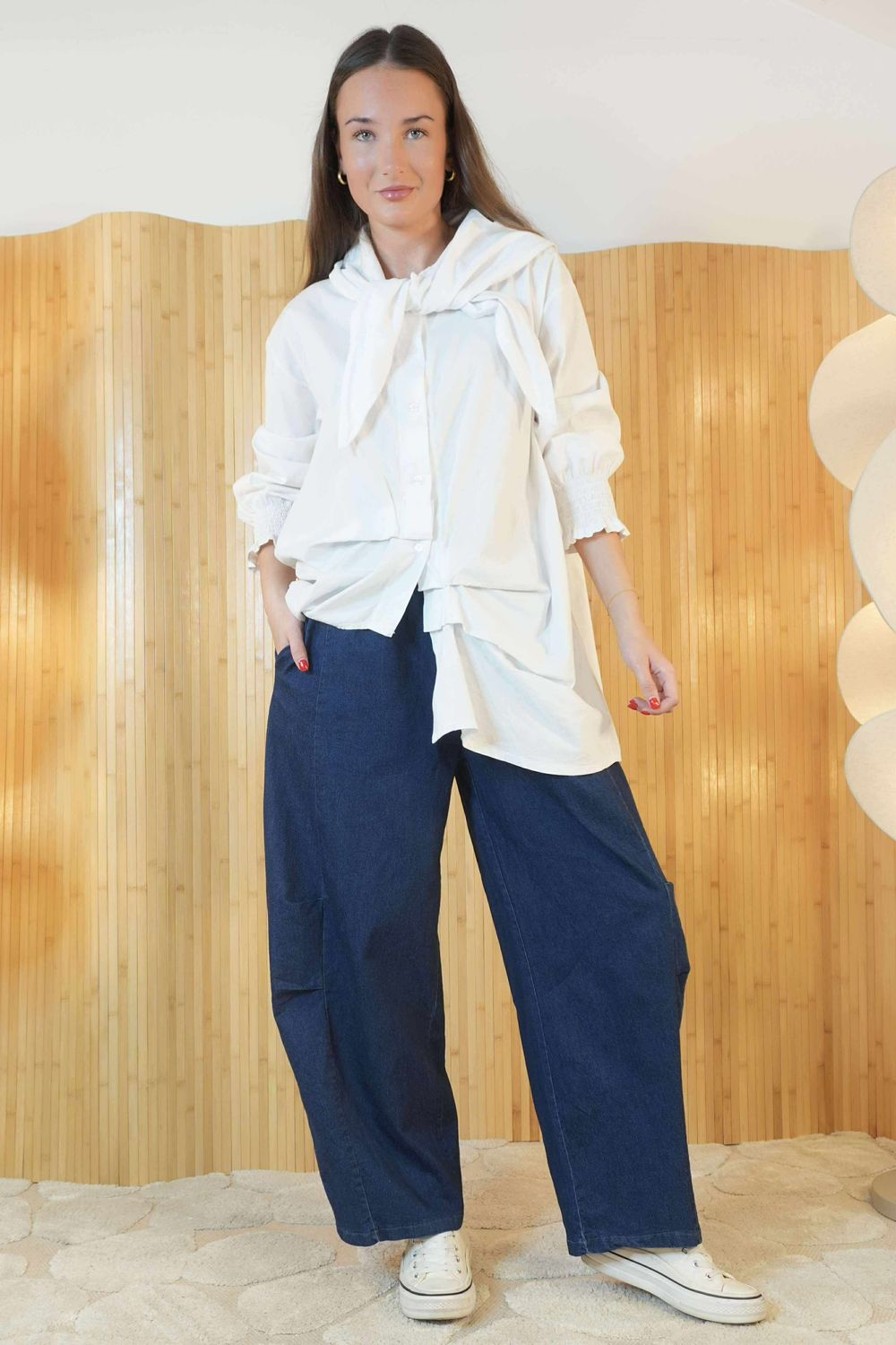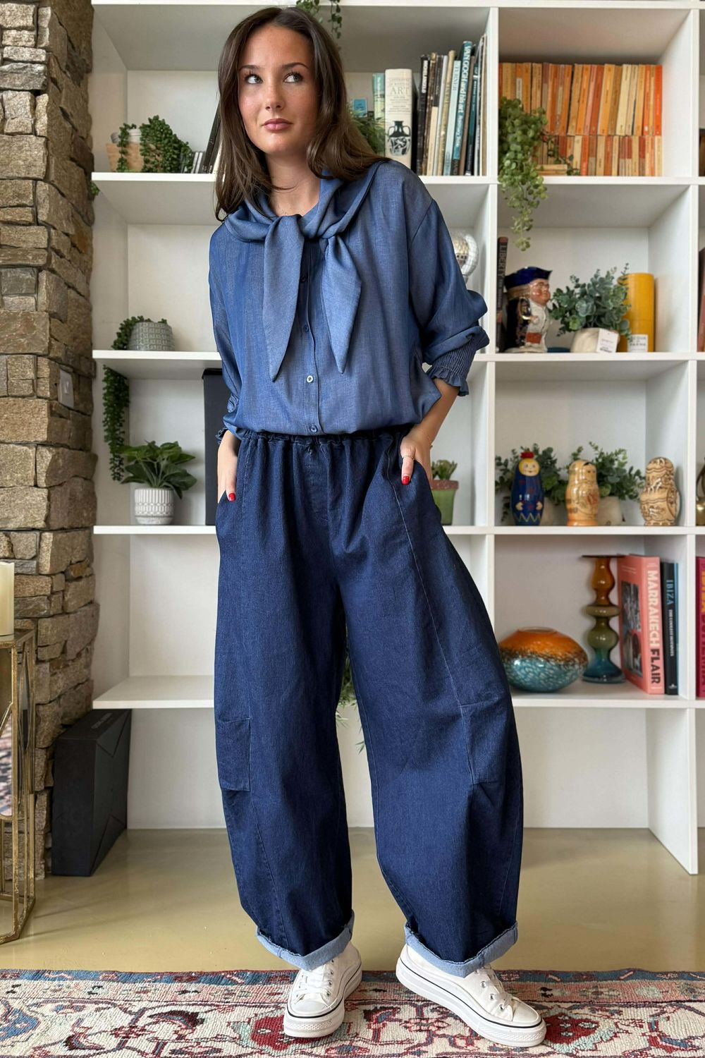 Say hello to the jeans that your wardrobe didn't know it needed : our jeans in dark denim from made in Italy clothing are totally game-changing. These women’s one-size jeans in dark denim are the definition of effortless style and comfort. Crafted from lightweight cotton denim with a hint of stretch, they’re designed for easy movement and all-day wearability. The modern barrel silhouette gently tapers at the ankle for a relaxed yet flattering shape, while the soft, elasticated waistband makes them an easy pull-on-and-go option. Finished with practical pockets—because all trousers should be—this pair blends laid-back ease with everyday versatility.