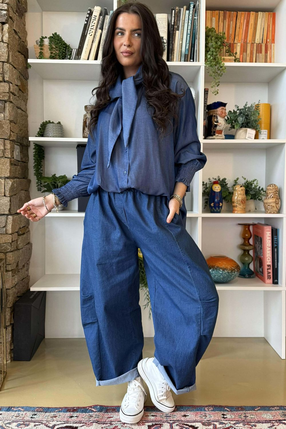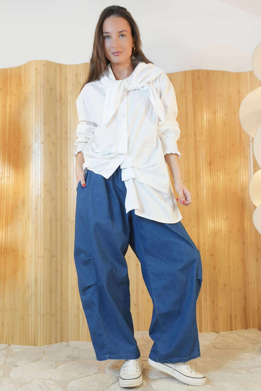 Say hello to the jeans that your wardrobe didn't know it needed: our jeans in mid denim from made in Italy clothing are totally game-changing. These women’s one-size jeans in dark denim are the definition of effortless style and comfort. Crafted from lightweight cotton denim with a hint of stretch, they’re designed for easy movement and all-day wearability. The modern barrel silhouette gently tapers at the ankle for a relaxed yet flattering shape, while the soft, elasticated waistband makes them an easy pull-on-and-go option. Finished with practical pockets—because all trousers should be—this pair blends laid-back ease with everyday versatility.